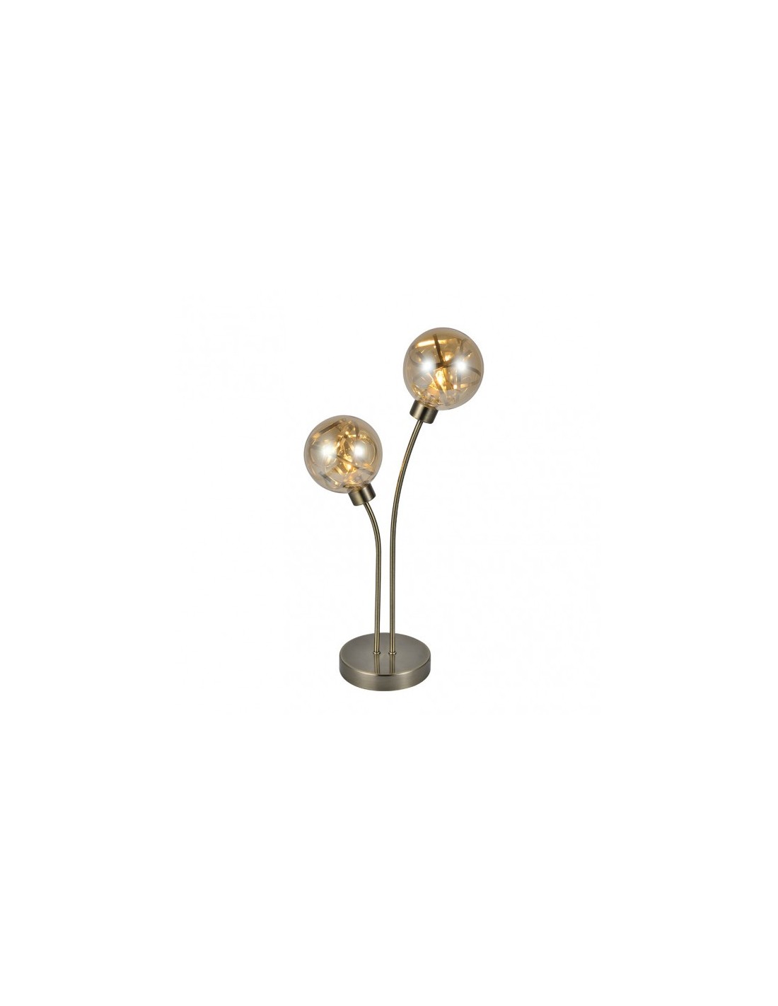 Sobremesa de dos luces serie VARANASI, realizada en metal color CUERO y tulipas de cristal ámbar y metal. Diseño moderno y muy original, resaltando además de su forma sus tulipas, en las que el cristal deja ver un entresijo de cintas de metal en su interior, resultando una composición muy especial para decorar cualquier rincón tanto en salones como en dormitorios con un toque muy personal. Tiene una dimensión de 46x27x13 centímetros y un peso neto 700 gramos. Posee dos porta lámparas en G9. Bombillas no incluidas. Puede completar la decoración de su hogar con las lámparas de cuatro y seis luces y los plafones de cuatro y seis luces. Todos los modelos también en color cromo.