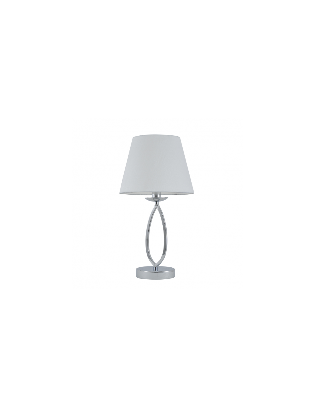 Sobremesa serie Veracruz de color cromo y pantalla blanca. Está realizado en metal y material textil. El cuerpo presenta una forma de ojal que le otorga gran originalidad. Sus dimensiones son 50x25x25 cm y su peso neto 1000 g. El portalámparas es E14. Está disponible en color cuero con pantalla beis. Puede completar la familia con el pie de salón, aplique, lámpara de tres, cinco y seis luces en color cromo.