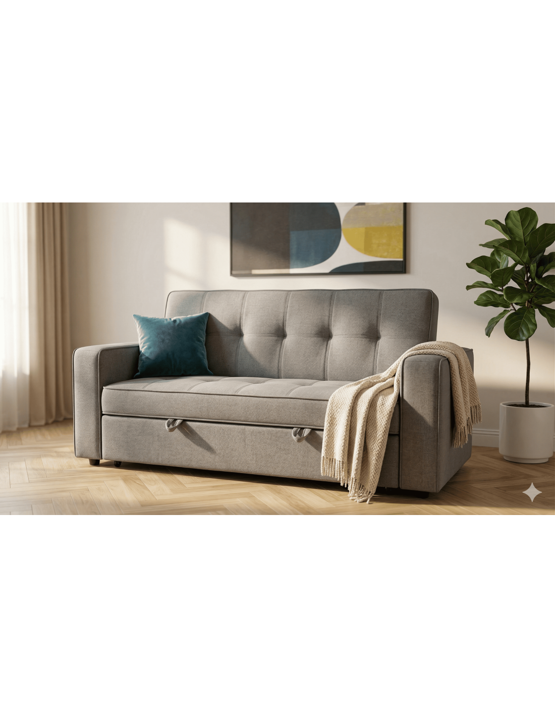 Duplica la funcionalidad de tu hogar con el Modelo ROL, el sofá cama de dos plazas que combina confort diario con una solución de descanso práctica. Su diseño contemporáneo en tela gris claro con capitoné de botones se adapta a cualquier salón o estudio. Gracias a sus brazos estructurados y su sistema de apertura frontal, ofrece una cama robusta y acogedora en segundos, sin ocupar espacio extra cuando está cerrado. Un indispensable para hogares inteligentes.