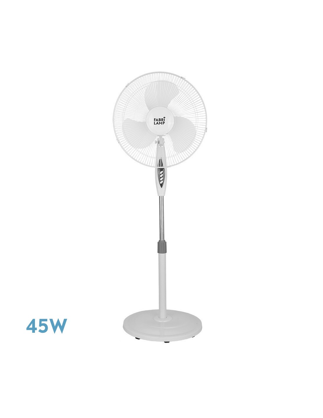 Ventilador de Pie de la serie BISE en color BLANCO con tres aspas y tres velocidades. Realizado en metal y policarbonato. Motor AC. Tiene una potencia de 45 watios. Dos posiciones, fijo y rotatorio, también oscilante, pudiéndose redirigir el aire a la zona deseada. Presenta unas dimensiones, con altura regulable, de 105<130x43x40 centímetros. Mando a distancia INCLUIDO y TEMPORIZADOR de 0,5 a 7,5 horas.