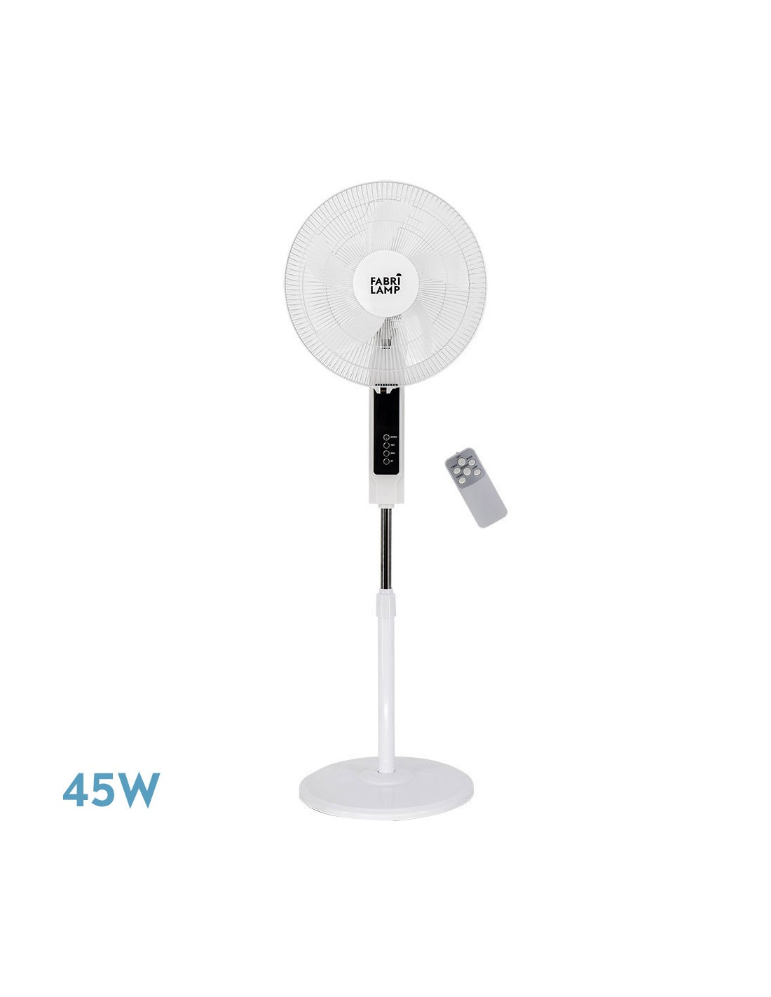 Ventilador de pie CACIMBO realizado en metal y policarbonato, de color BLANCO con detalles en cromo. Con cinco aspas transparentes y tres velocidades. Motor AC. Cabezal orientable, con display y temporizador. Mando a distancia INCLUIDO. Tiene una medida regulable en altura de 122<140x43x40 centímetros. Modelo también disponible en color negro.