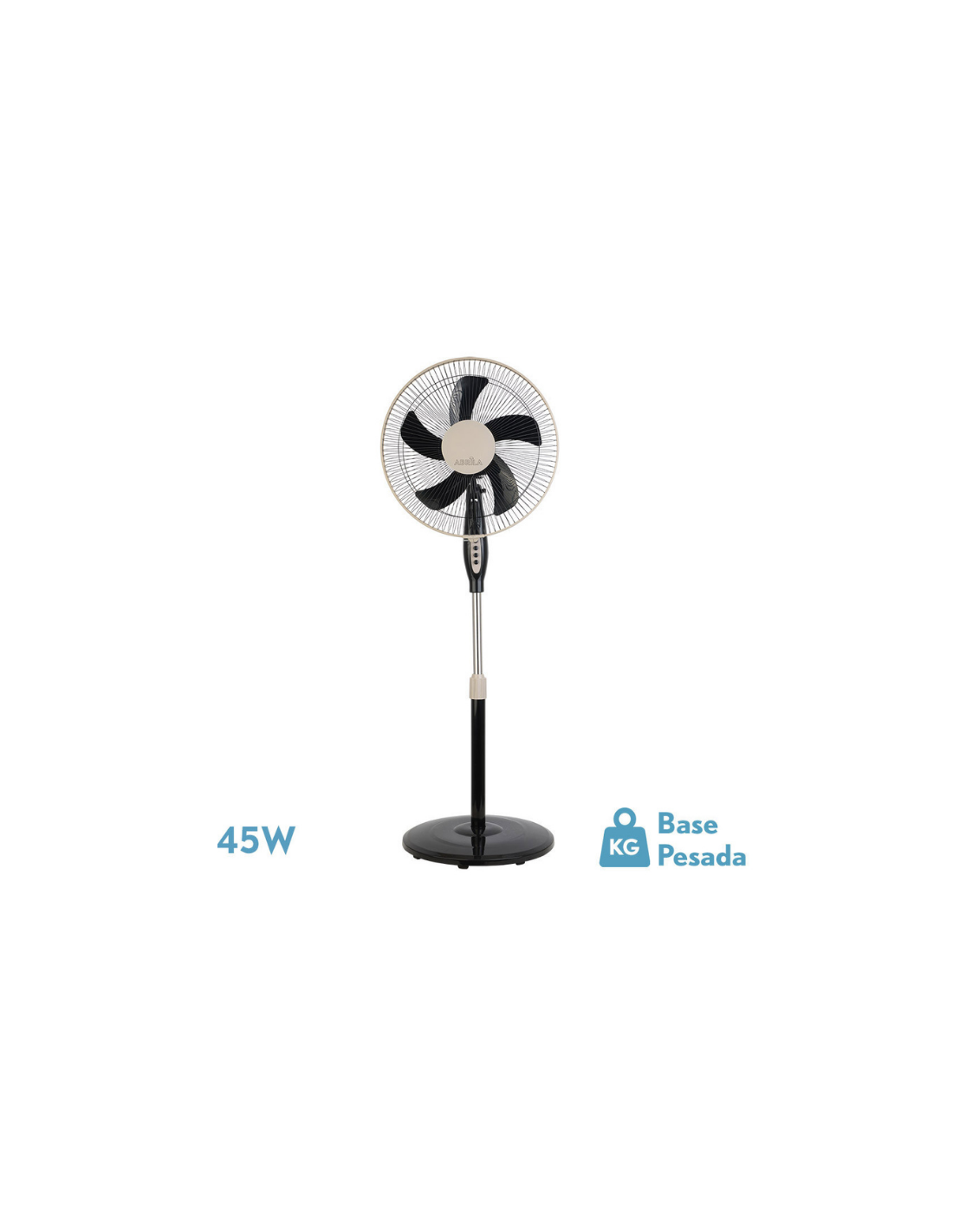 Descubre la eficiencia y el estilo con el Ventilador de Pie BELMONTE en colores Negro/Beis y Blanco/Gris. Con su potente motor de 45 watios, cinco aspas y tres velocidades ajustables, ofrece una brisa refrescante y una cobertura personalizable. Su diseño moderno y base estable lo convierten en la adición perfecta para cualquier espacio, asegurando confort y elegancia en tu hogar.