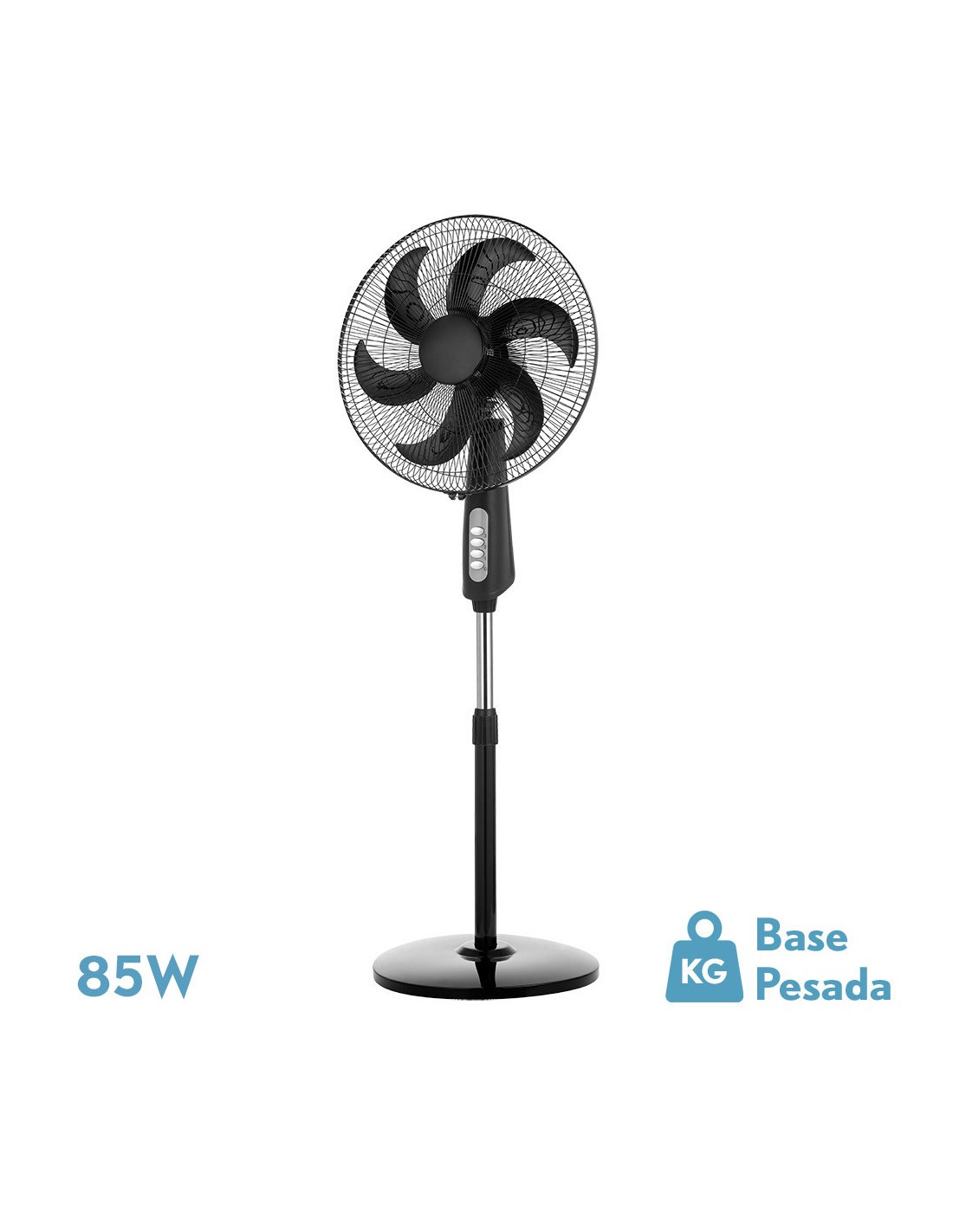 Ventilador de Pie de la serie GRANIZO en color NEGRO con seis aspas y tres velocidades. Realizado en aluminio y policarbonato. Motor AC. Tiene una potencia de 85 watios. Dos posiciones, fijo y rotatorio, también oscilante, pudiéndose redirigir el aire a la zona deseada y ampliando la zona de ventilación dependiendo de las necesidades de la estancia. De diseño sencillo y fácil manejo, dispone de una base redonda y pesada para una mayor estabilidad. Presenta unas dimensiones, regulables en altura, de 110<140x50x43 centímetros.