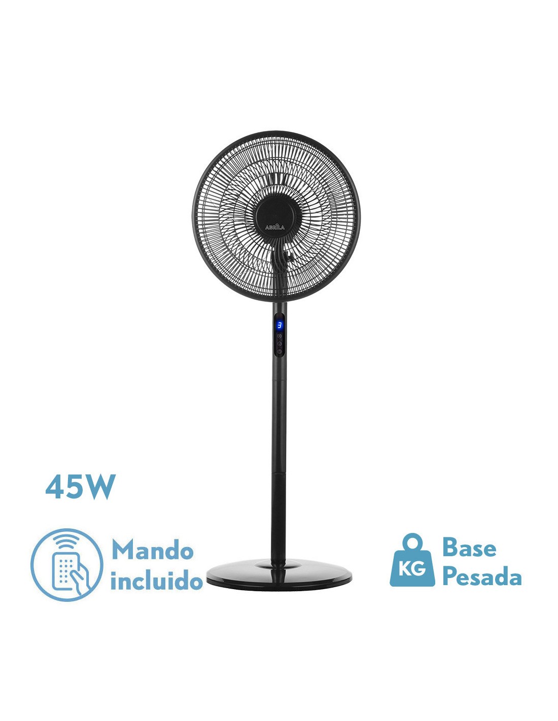 Ventilador de Pie de la serie ICONO en color NEGRO con cinco aspas y tres velocidades. Realizado en metal y policarbonato. De diseño moderno, 45 watios de potencia, TACTIL, con MANDO A DISTANCIA incluido y TEMPORIZADOR, pudiendo programarlo para que se apague automáticamente de 1 a 8 horas, aportando un gran ahorro de energía. Con dos posiciones fijo y rotatorio, pudiendo difundir el aire rápidamente por toda la estancia. Tiene una medida de 119x44x40 centímetros. Modelo disponible en color blanco y negro.