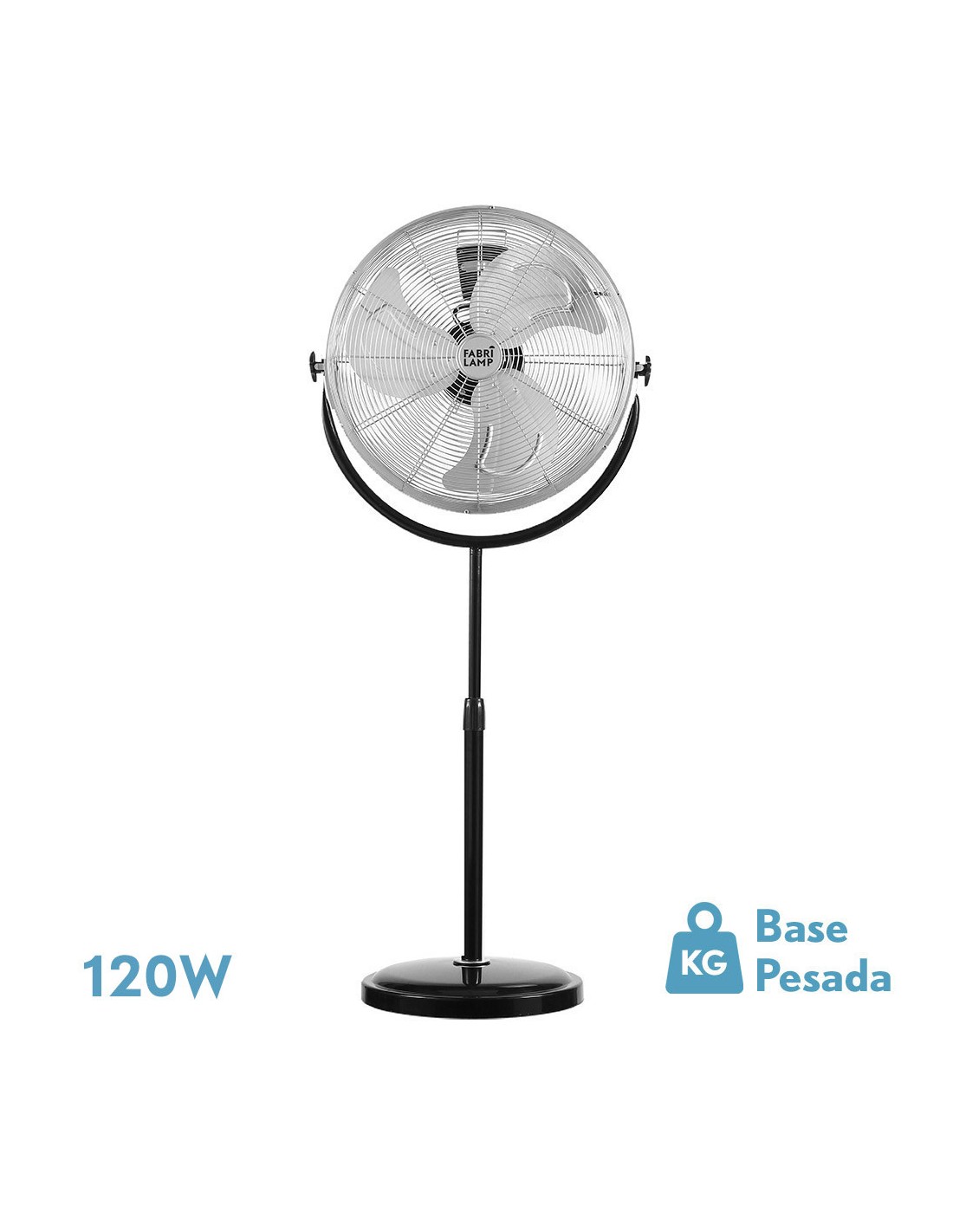 Ventilador de pie TRASCIAS realizado en metal, aluminio y policarbonato, de color NEGRO con tres aspas de color PLATA y tres velocidades. Motor AC. Cabezal orientable. Tiene una potencia de 120 watios. Presenta una medida regulable en altura de 120<155X55X55 centímetros.