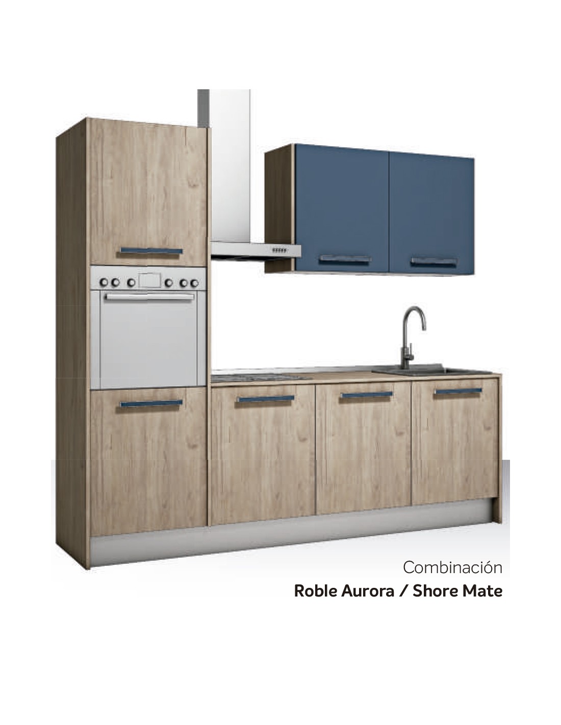 Moderna cocina que destaca por su elegancia y eficiencia. Gracias a su amplio espacio de almacenamiento y su zona de trabajo, esta cocina es el complemento ideal para su hogar. Su estética simple y minimalista será el componente perfecto para un espacio de cocina eficiente sin perder ni un ápice de estilo.