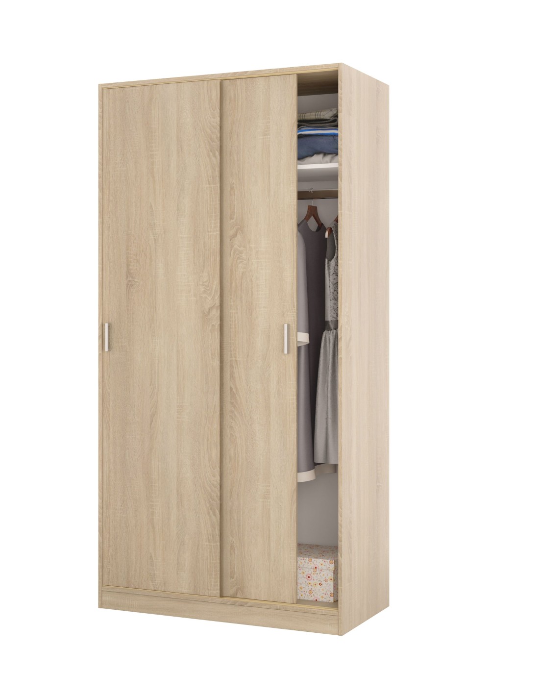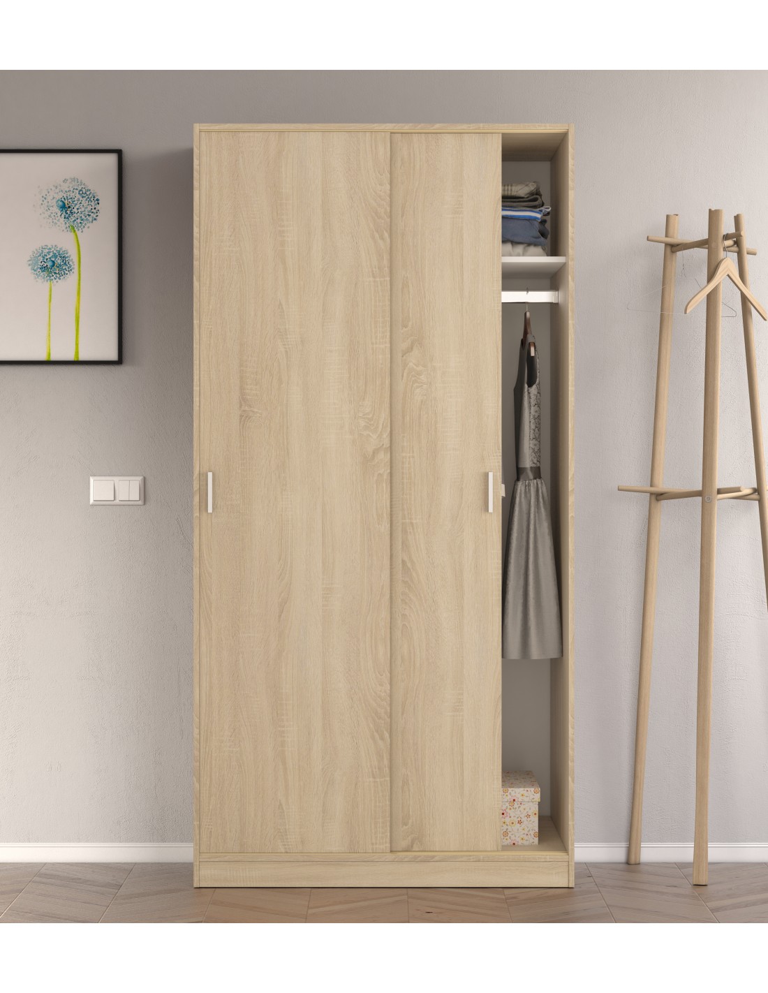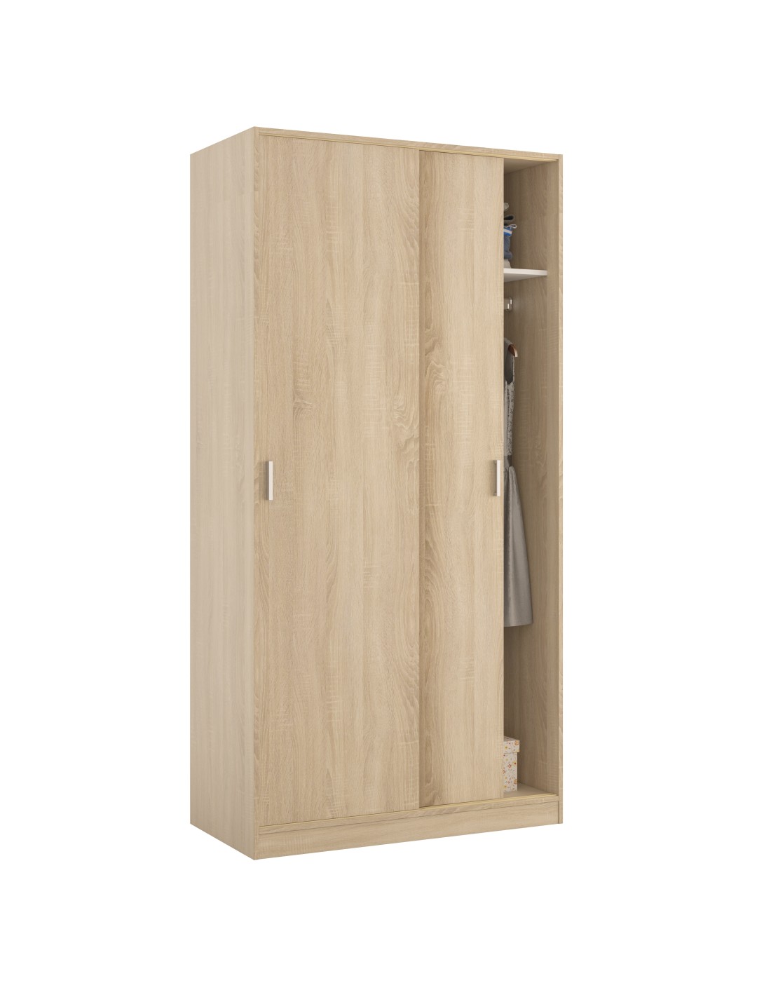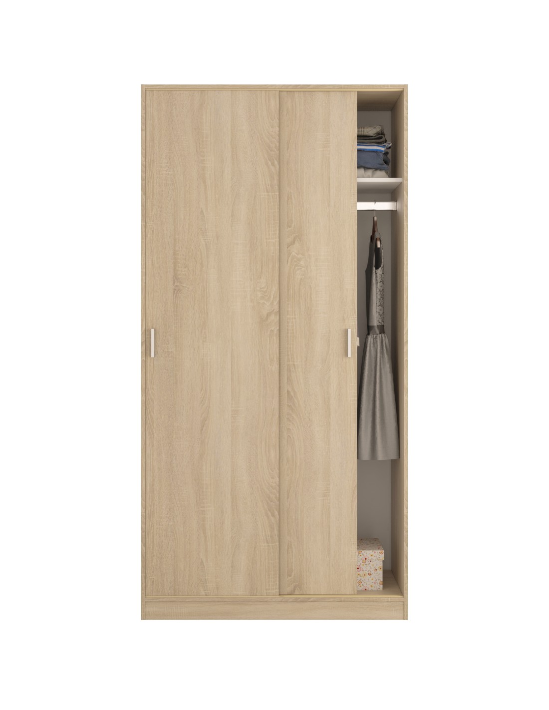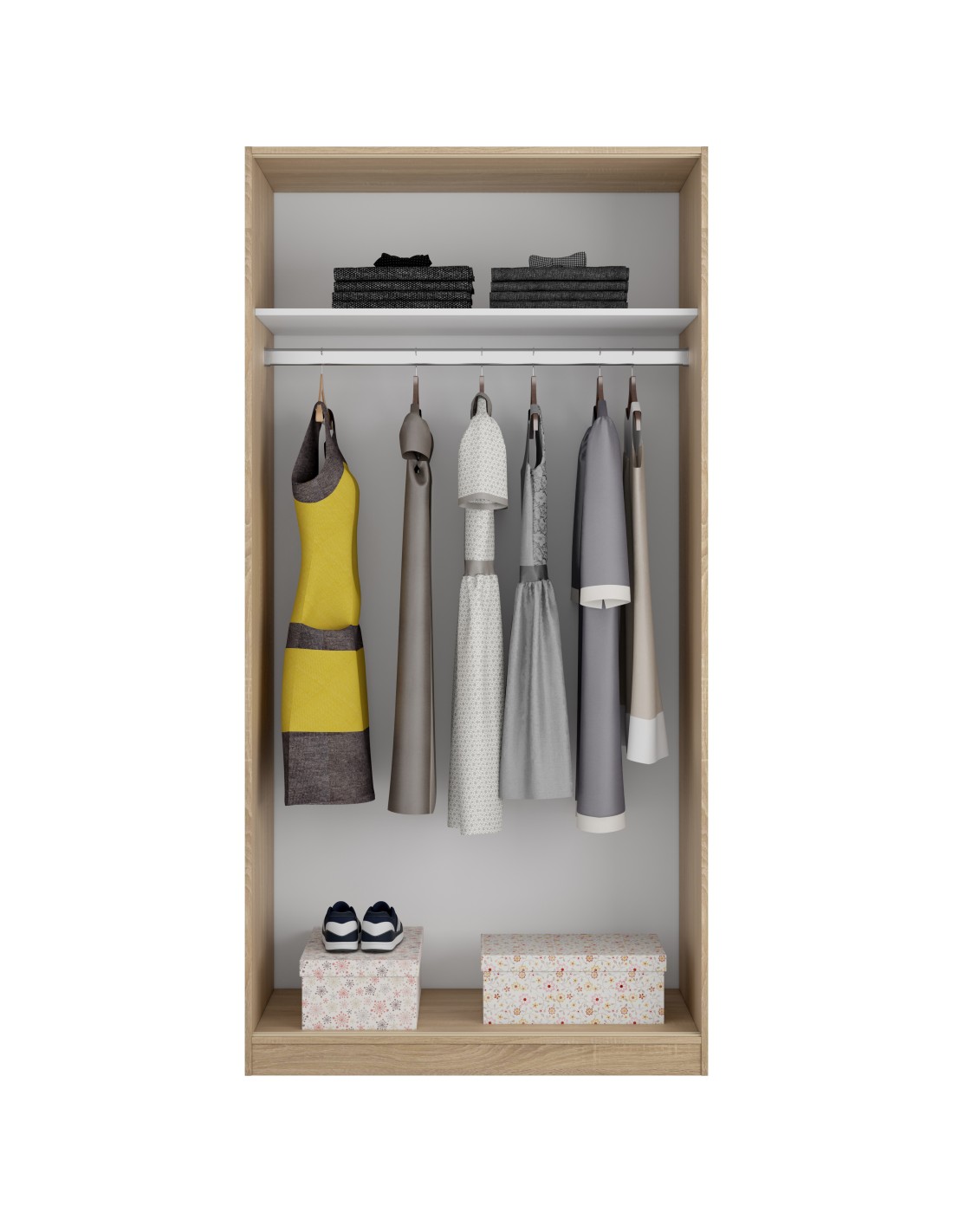 Armario de 2 puertas correderas con barra de colgar y un estante en su interior.