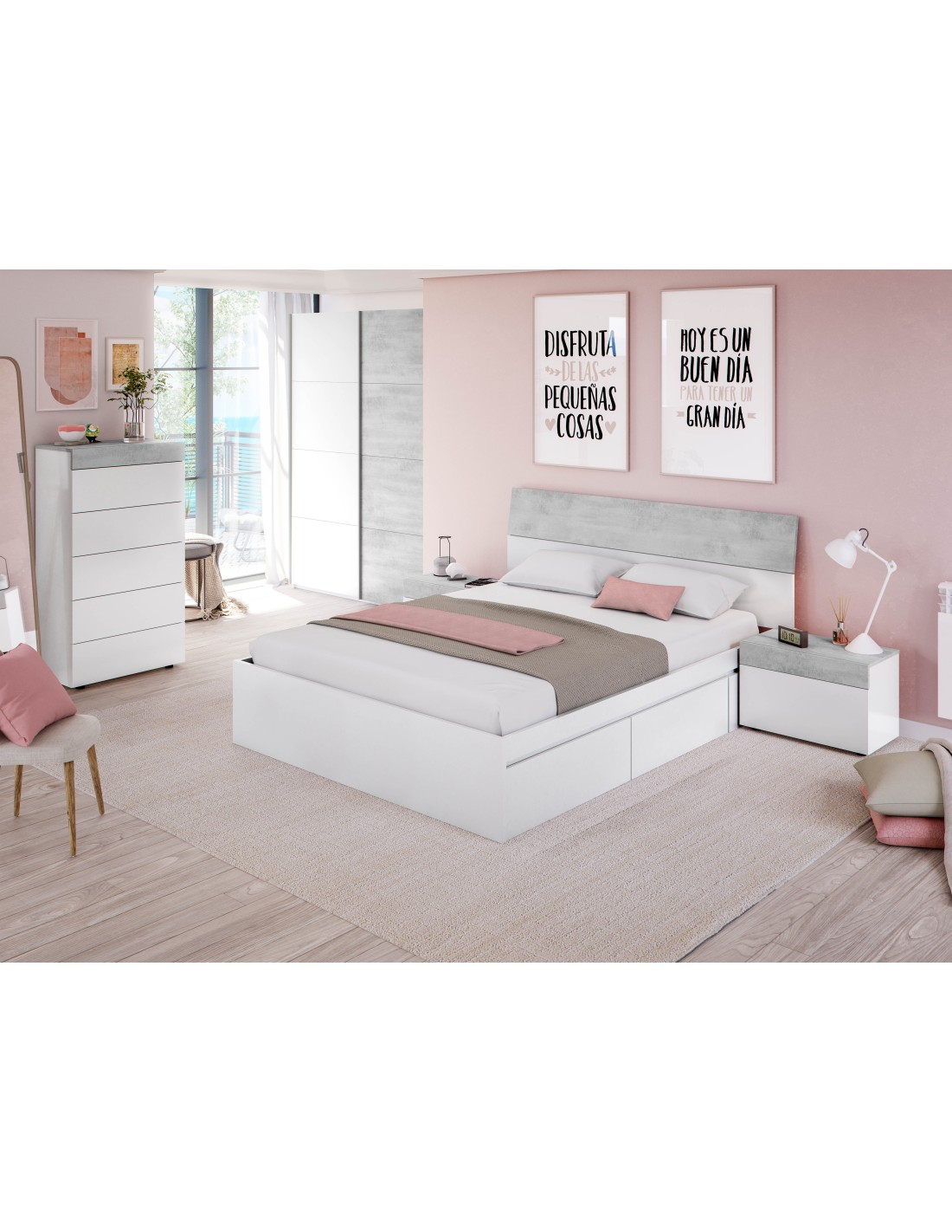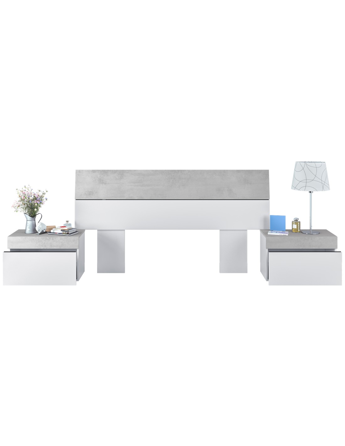 Cabezal + 2 Mesitas 1 cajón - Blanco Artik/Cemento