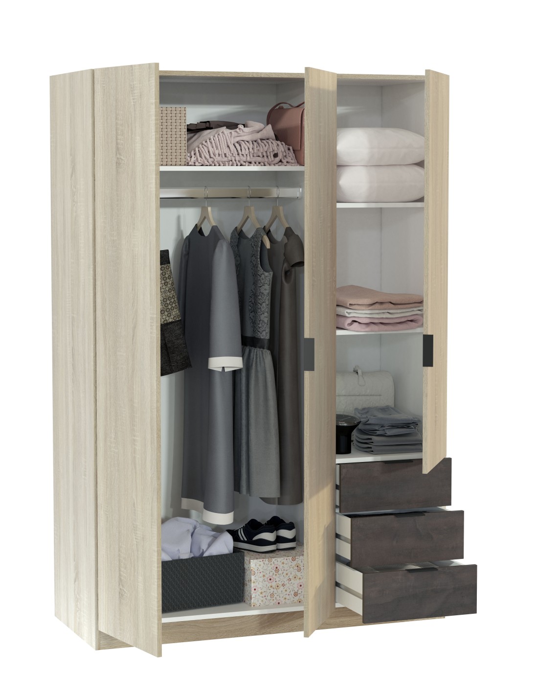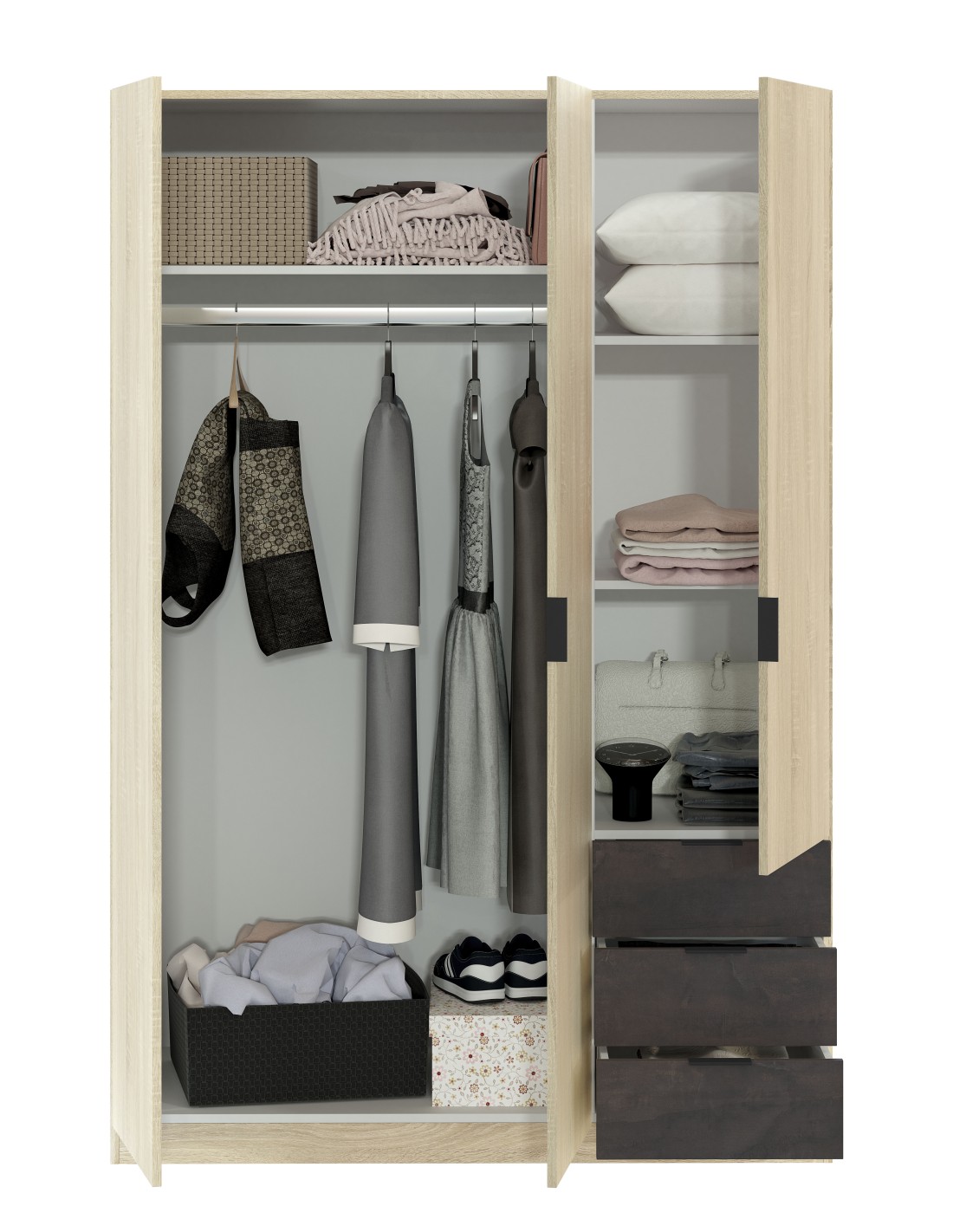 Armario de 3 puertas con barra de colgar y estantes en su interior y 3 cajones inferiores en la parte derecha.