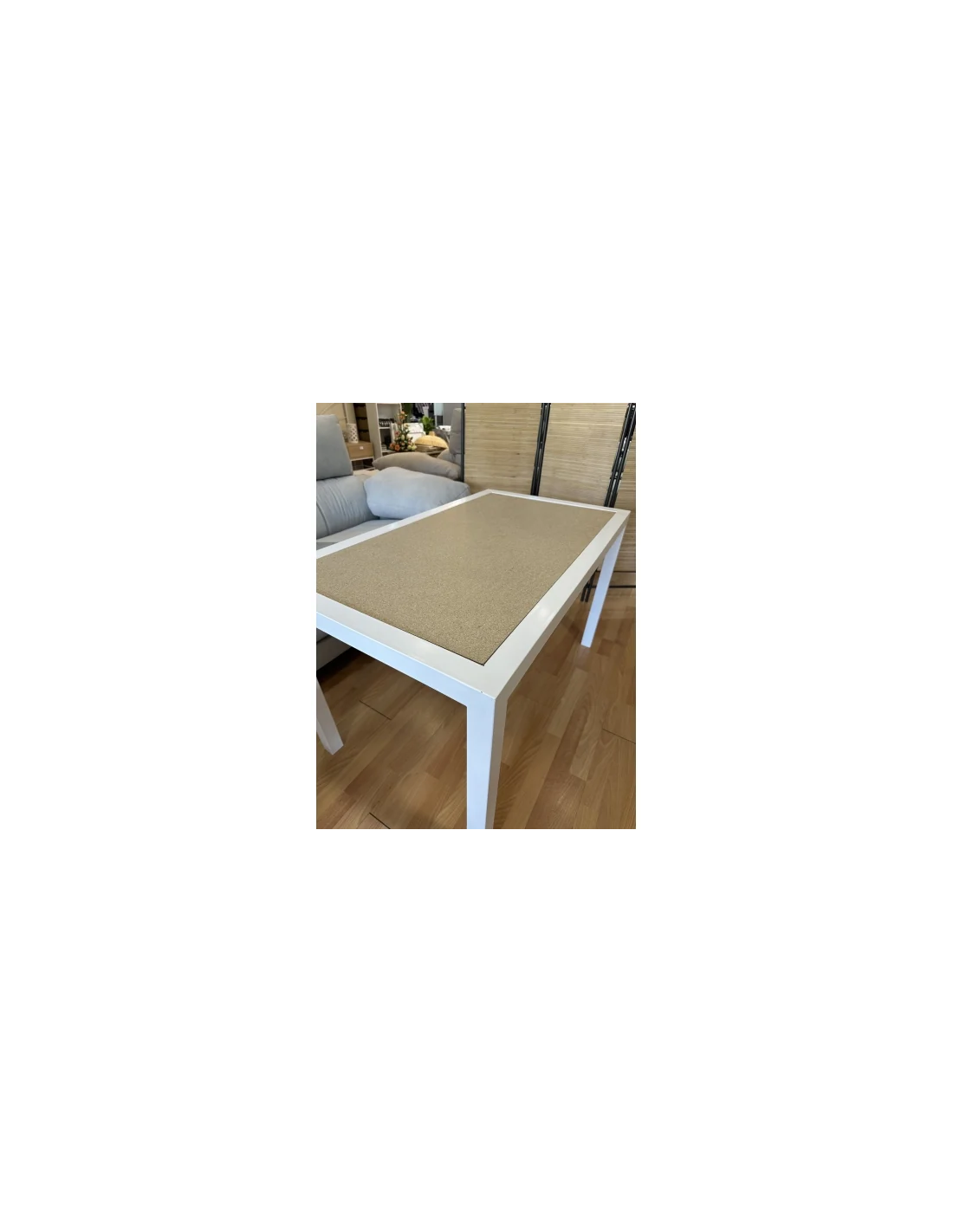 Mesa camilla de forja color blanco. Tamaños disponibles: 120x70 cm, 130x80 cm y 140x80 cm, todas con una altura de 73 cm.