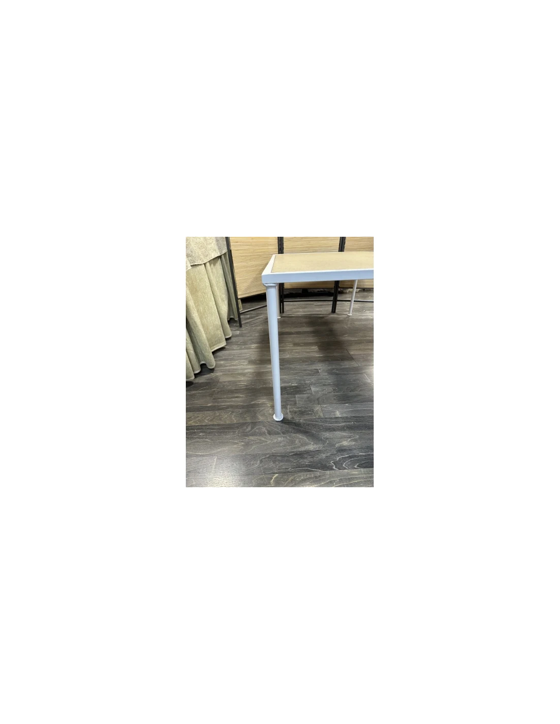 Mesa camilla de forja color blanco. Tamaños disponibles: 120x70 cm, 130x80 cm y 140x80 cm, todas con una altura de 73 cm.