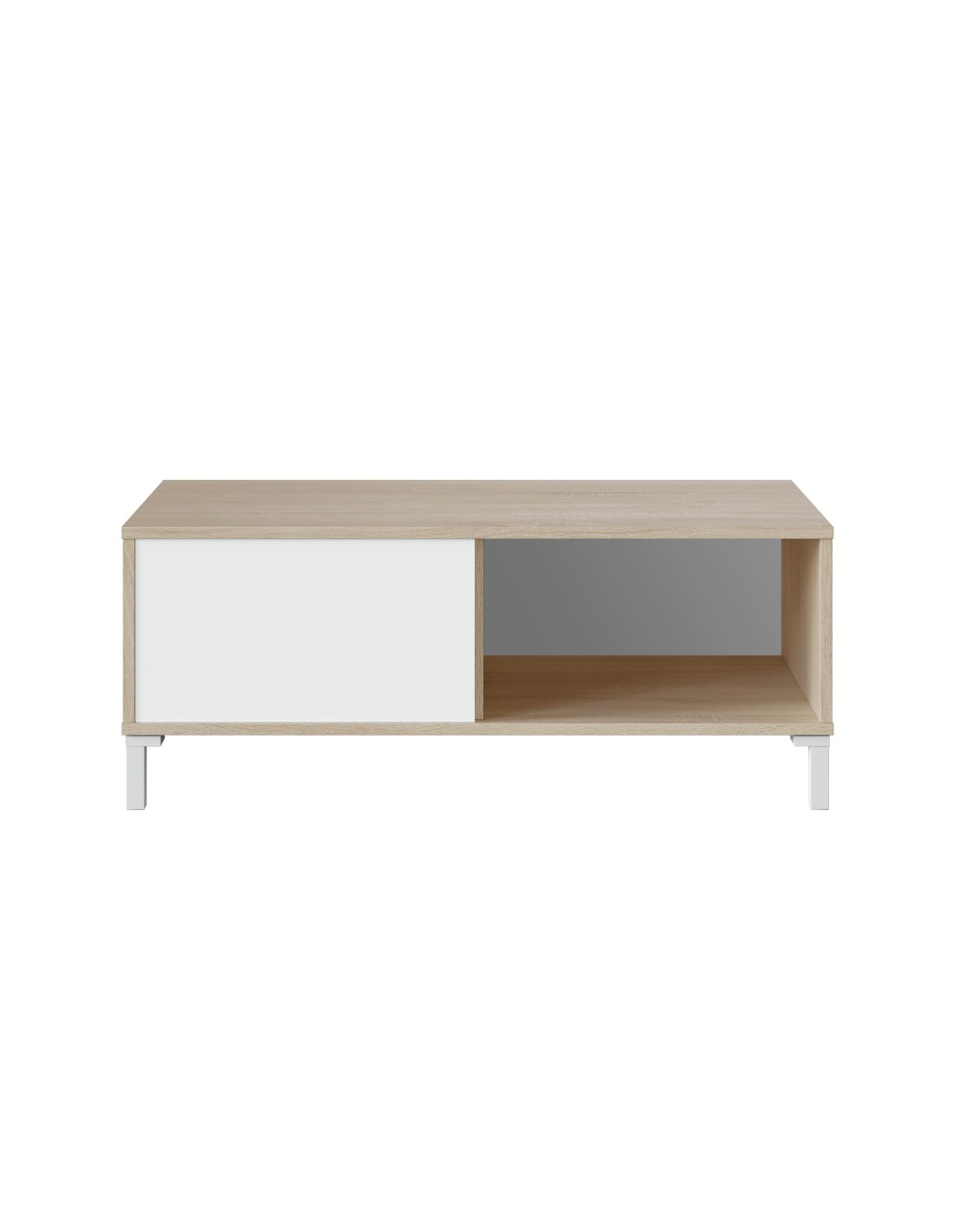 Mesa centro con patas y con dos huecos de almacenamiento.