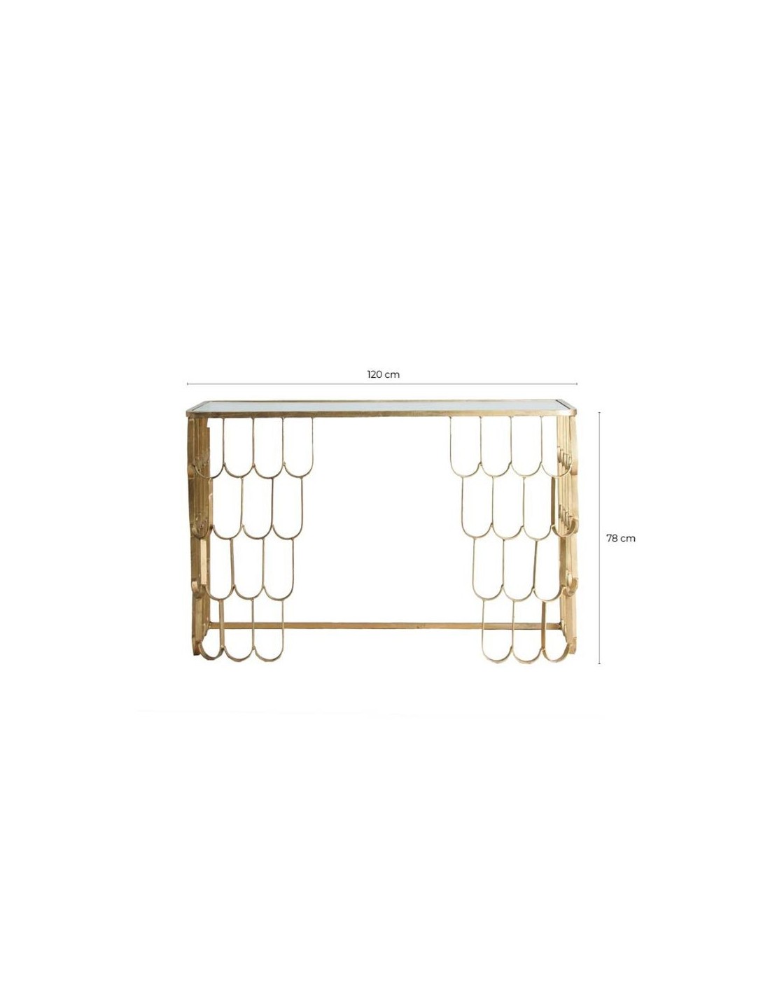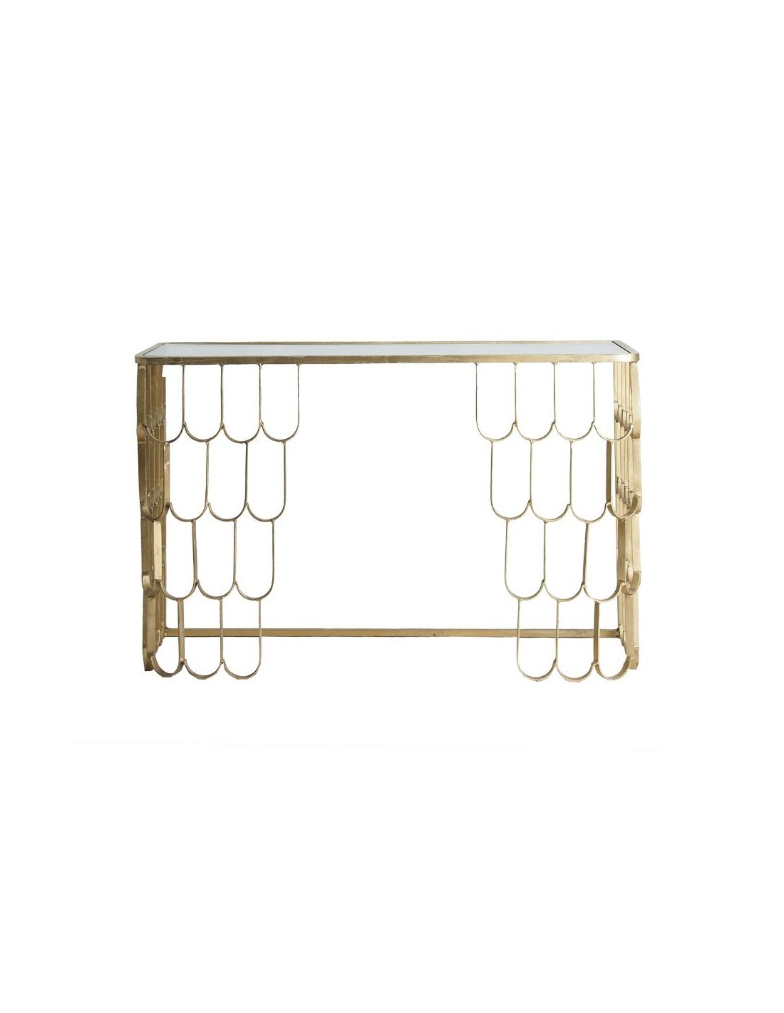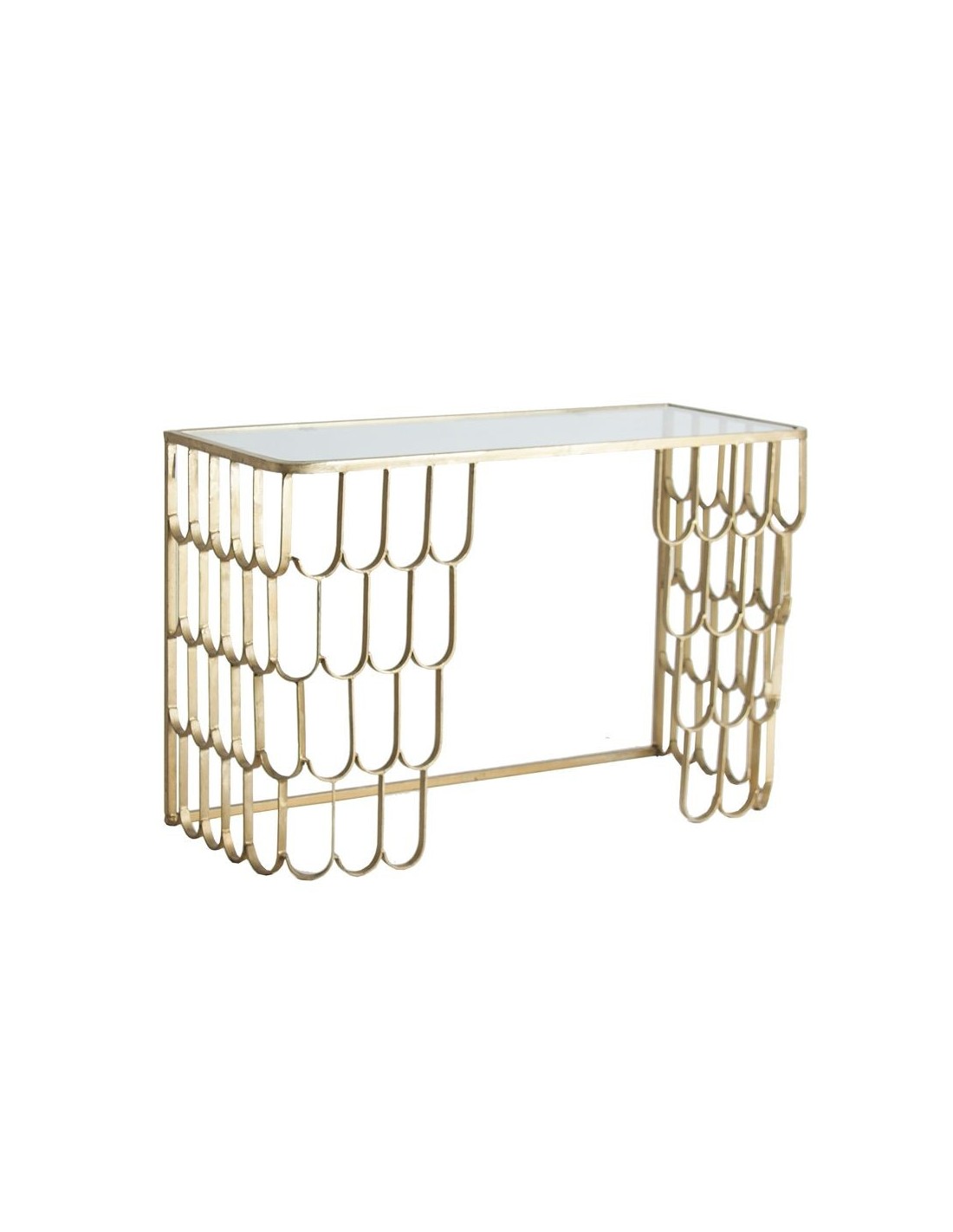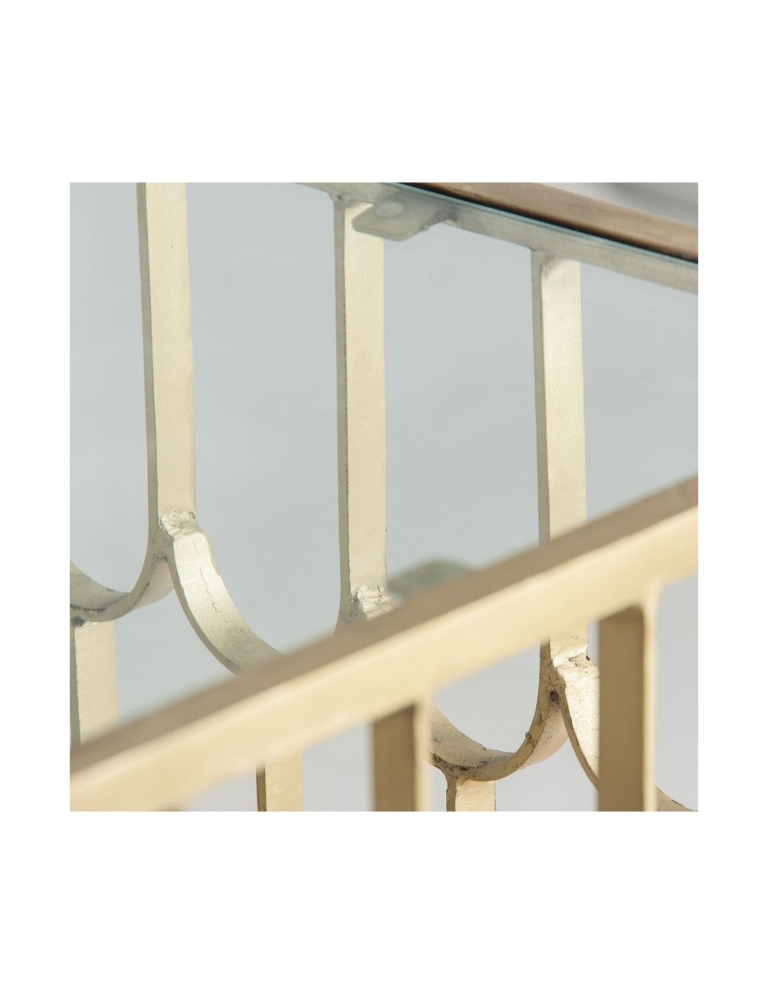 Escritorio Kusel, En Color Oro, De Estilo Art Deco. Fabricado En Hierro, Combinado Con Cristal. Cristal Transparente. Producto Desmontable.
