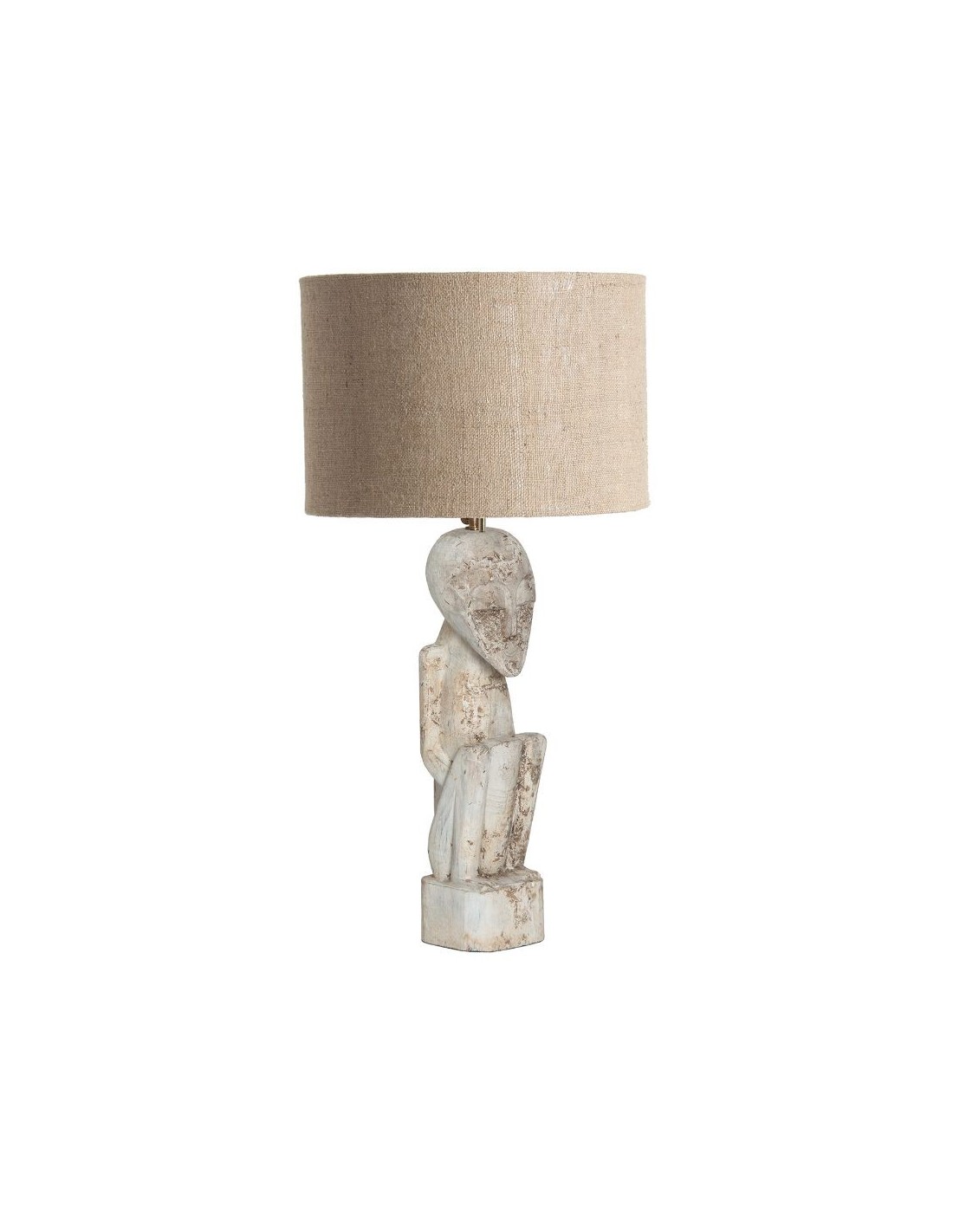 Lámpara De Sobremesa, En Color Tonos Claros Envejecido, De Estilo Étnico. Fabricado En Madera Tropical, Combinado Con Yute.