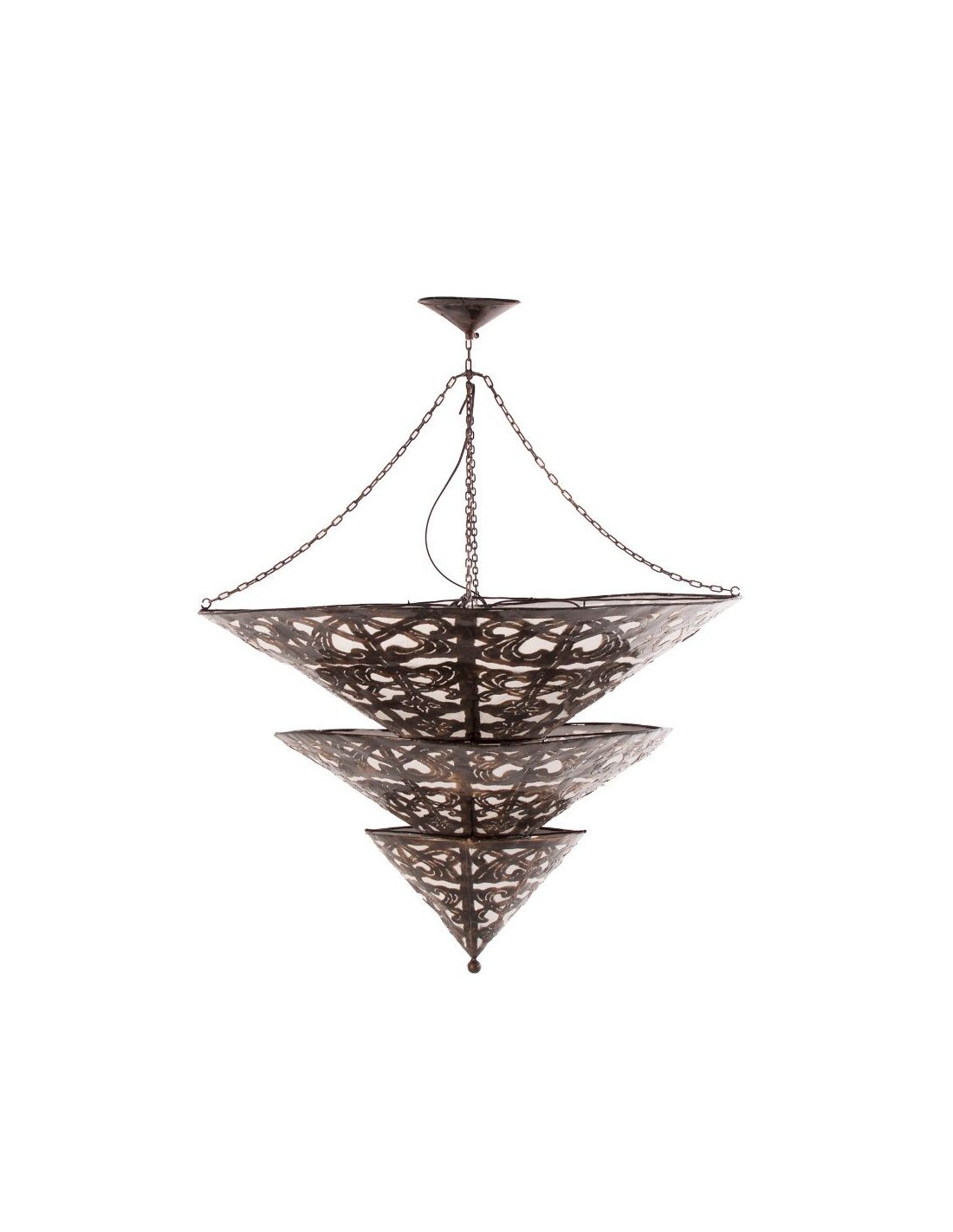 Lámpara De Techo Triangular, En Color Negra, De Estilo Oriental. Fabricado En Latón, Combinado Con Loneta Y Hierro.