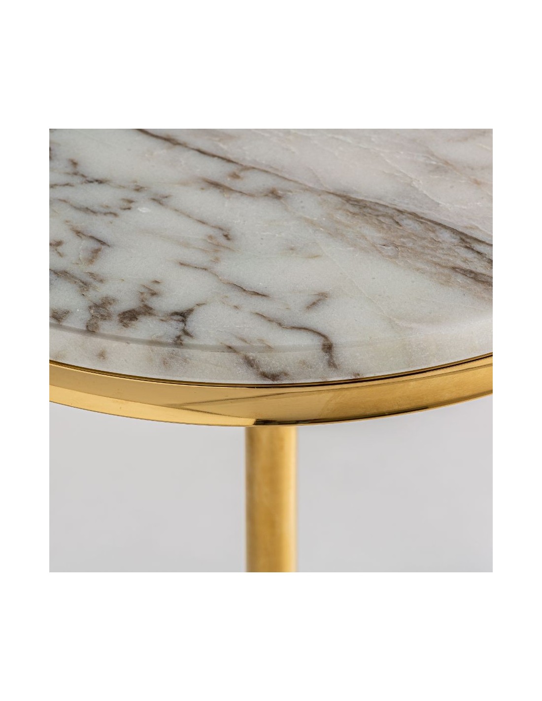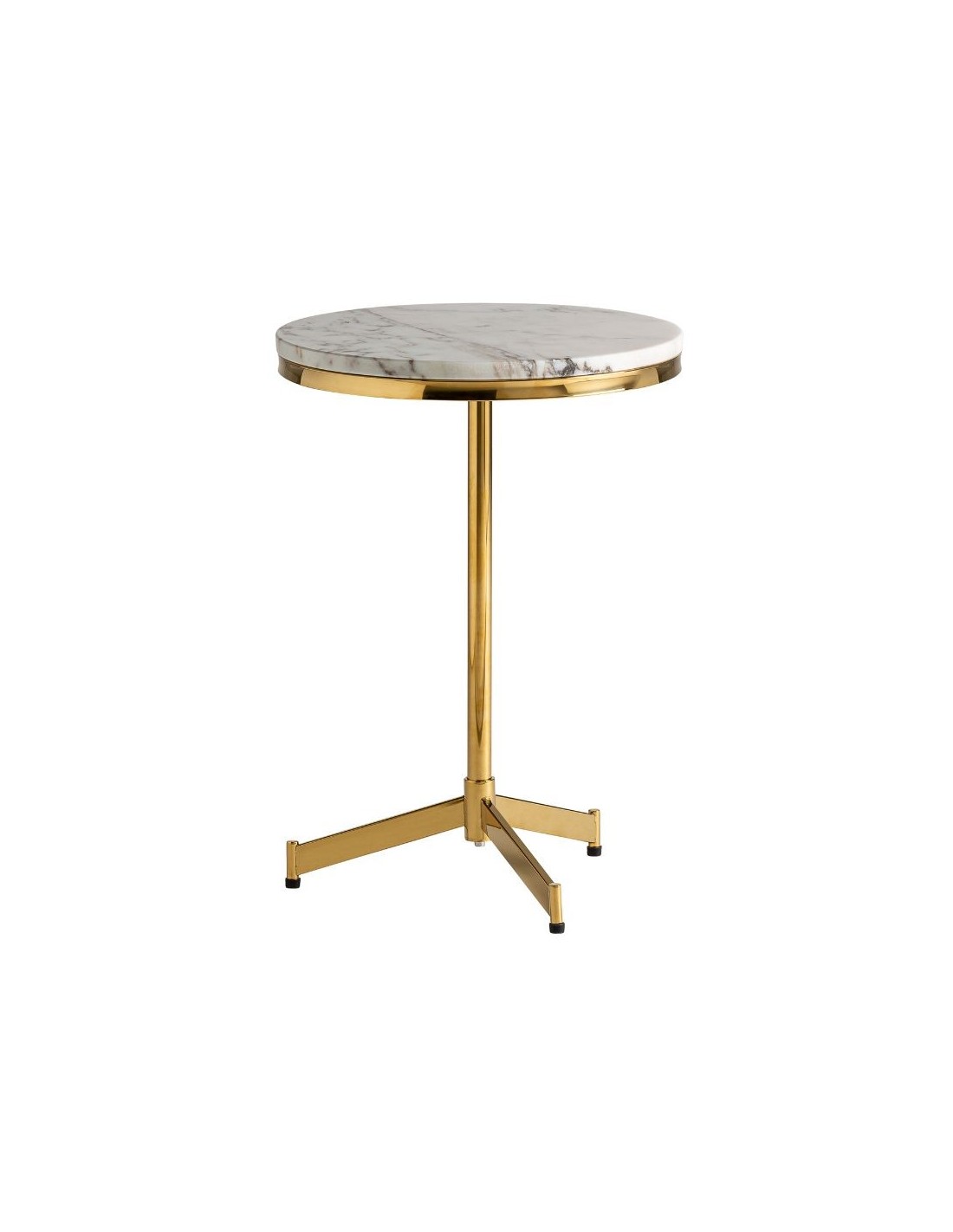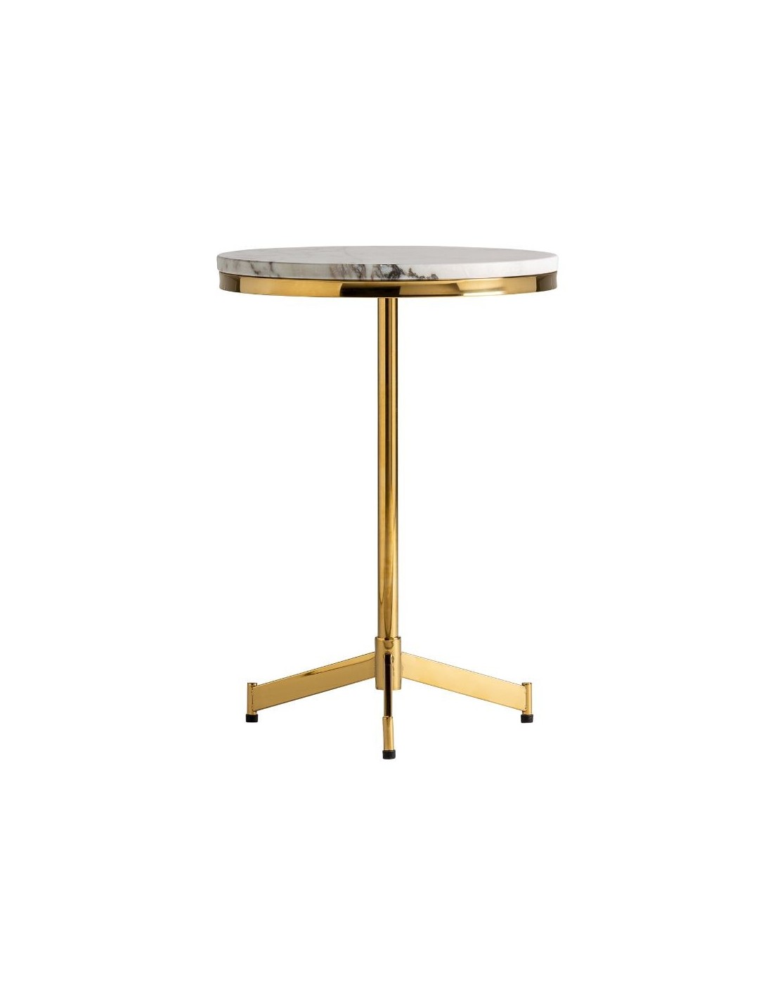 Mesa Auxiliar Redonda Ugod, En Color Blanco/Oro Brillo, De Estilo Art Deco. Fabricado En Acero, Combinado Con Mármol. Producto Desmontable.