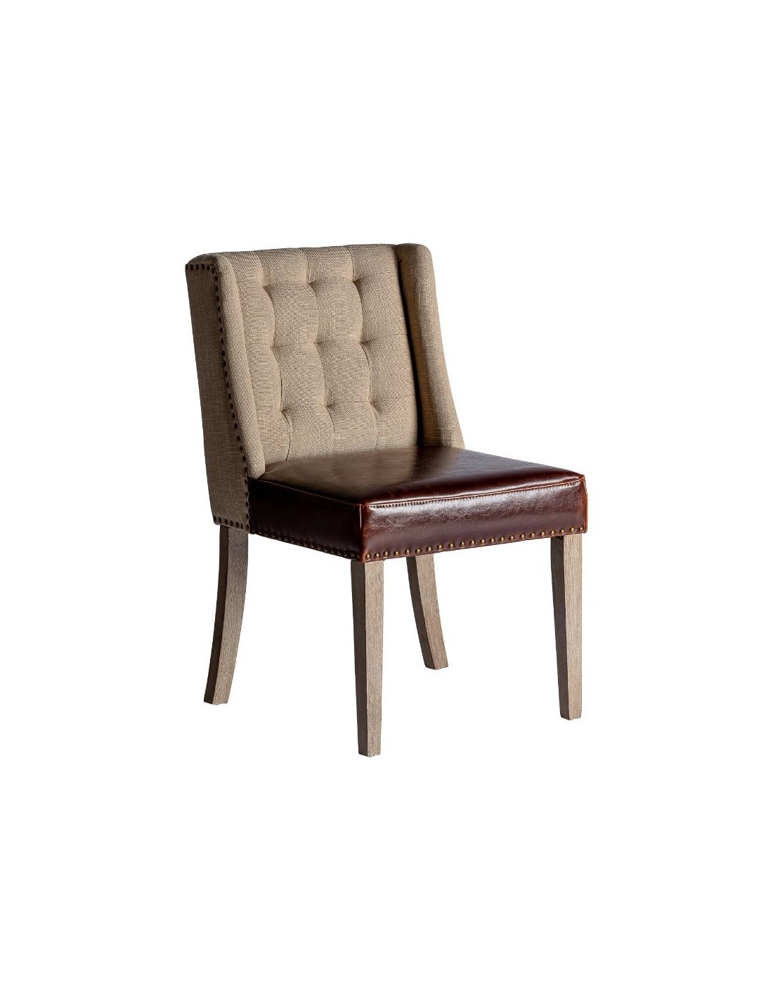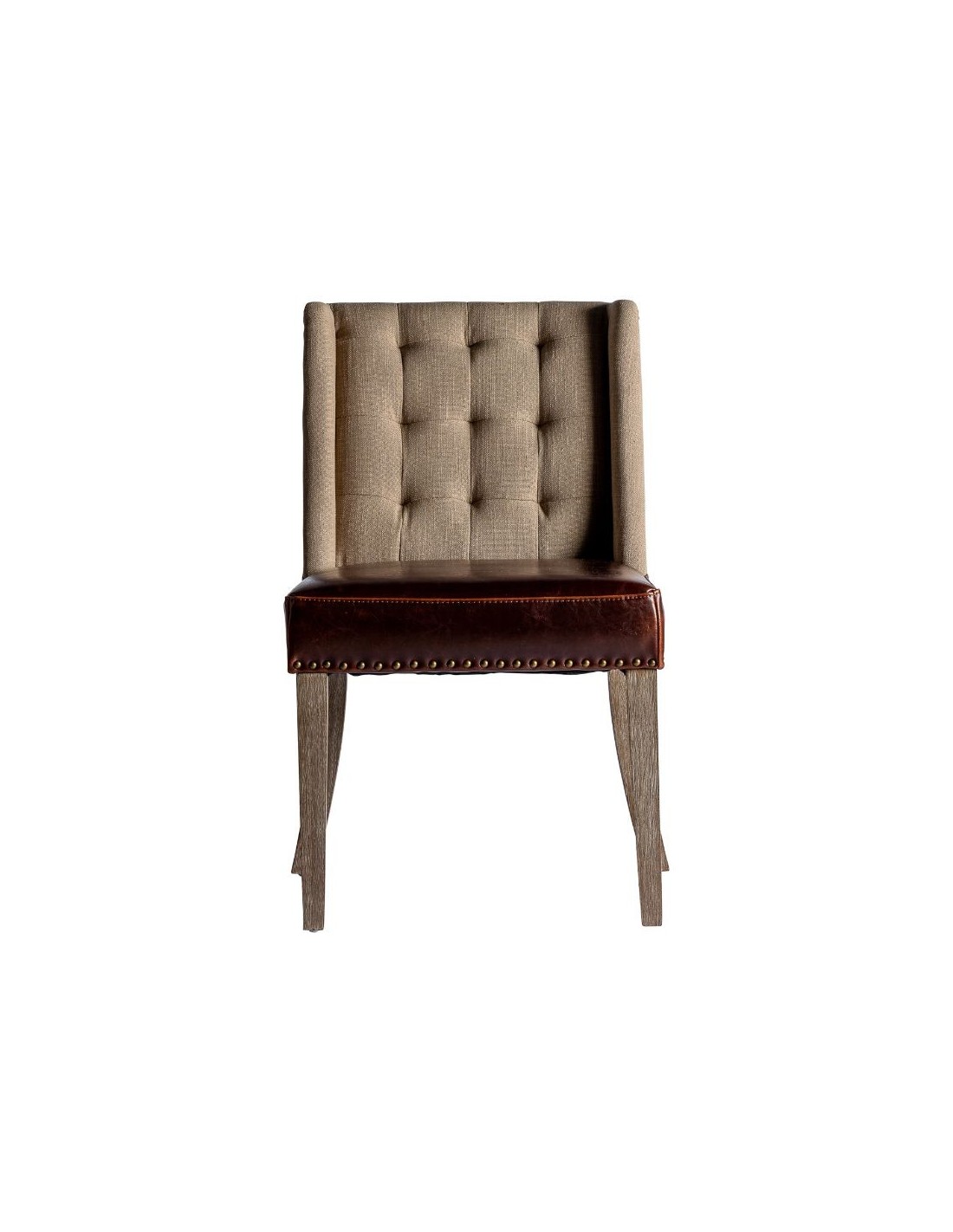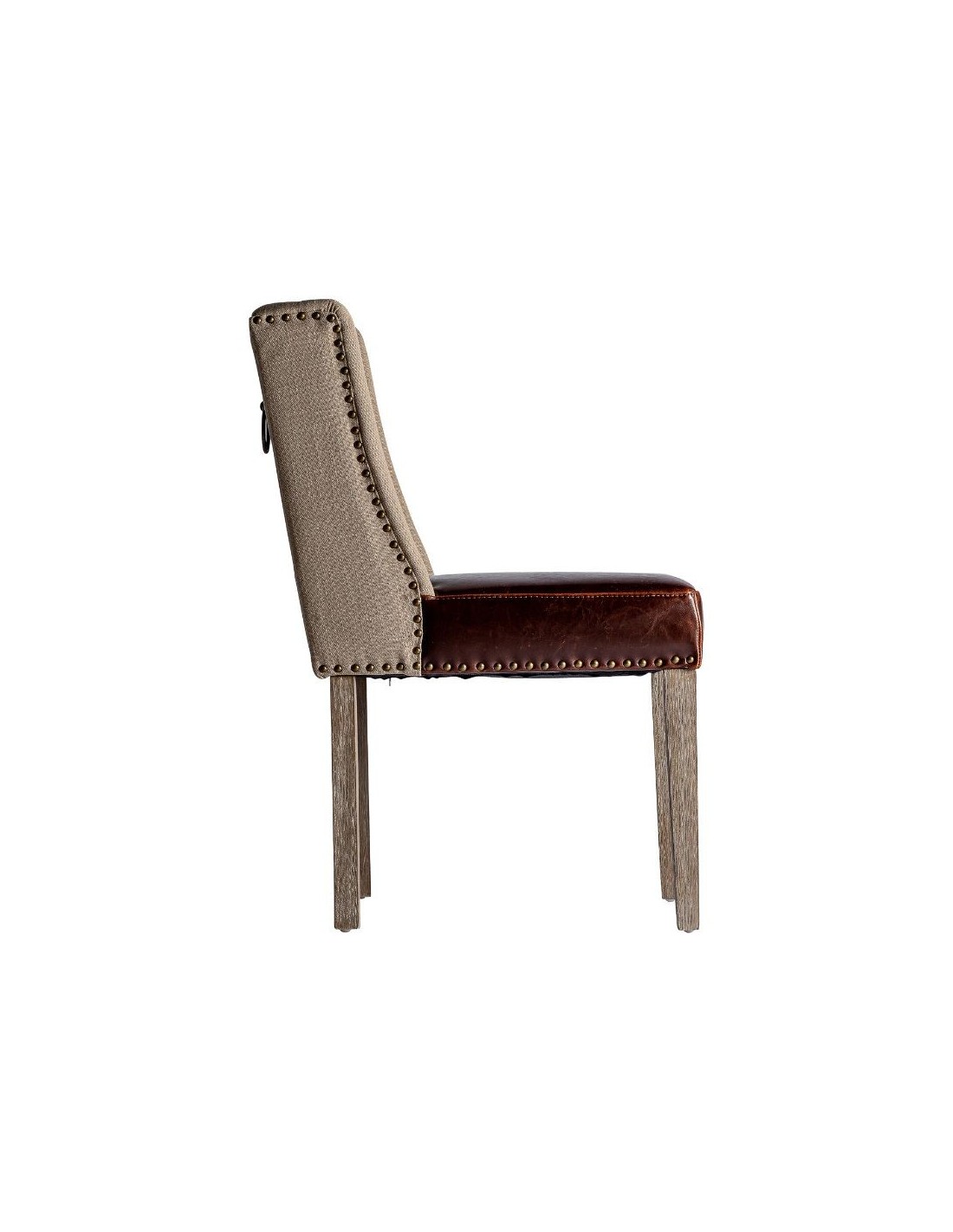 Silla Tunja, En Color Marrón, De Estilo Vintage. Fabricado En Madera De Pino, Combinado Con Loneta Y Cuero.