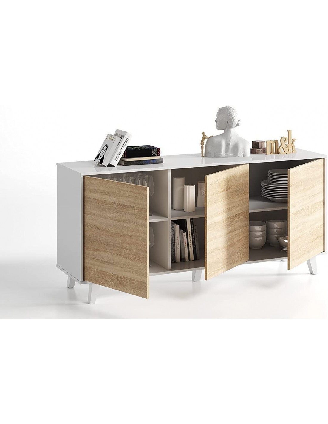 El aparador que incluye 3 puertas con huecos interiores de almacenaje, cada uno de ellos con una balda central que divide por la mitad el hueco, dando lugar a un total de 6 huecos para almacenaje. Las puertas incluyen un sistema de apertura con expulsores (el denominado sistema push), muy práctico y duradero. el aparador incluye 3 puertas con huecos interiores de almacenaje, cada uno de ellos con una balda central que divide por la mitad el hueco, dando lugar a un total de 6 huecos para almacenaje. Las puertas incluyen un sistema de apertura con expulsores (el denominado sistema push), muy práctico y duradero.