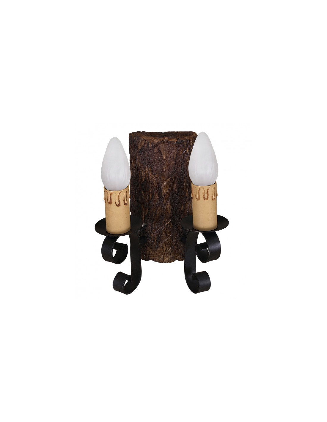 Aplique serie Tronco de dos luces. Este aplique forma parte de una familia compuesta por una lámpara de 4 y 6 luces, además de un aplique de una luz. Responde a un estilo rústico, ideal para casas de campo. Está realizado en resina que imita la madera, y metal de color negro. Utiliza dos portalámparas E27.