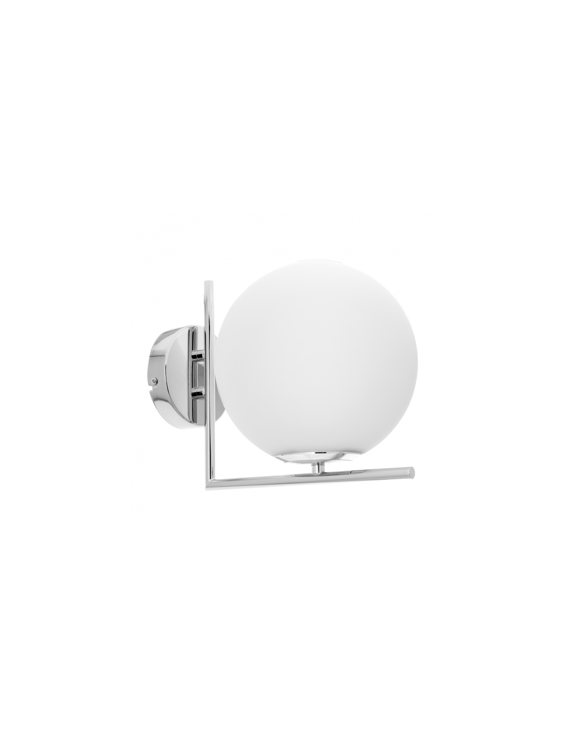 Aplique serie Aimee de color cromo. Este original aplique está formado por un cuerpo de metal en forma de ángulo de 90 grados. Sobre él descansa una esfera de cristal de color blanco. Forma parte de una familia completa donde puede combinar distintos modelos de colgantes y el sobremesa a juego. Sus dimensiones son 22x20x27,5 cm y su peso neto 880 g. El portalámparas es E27.