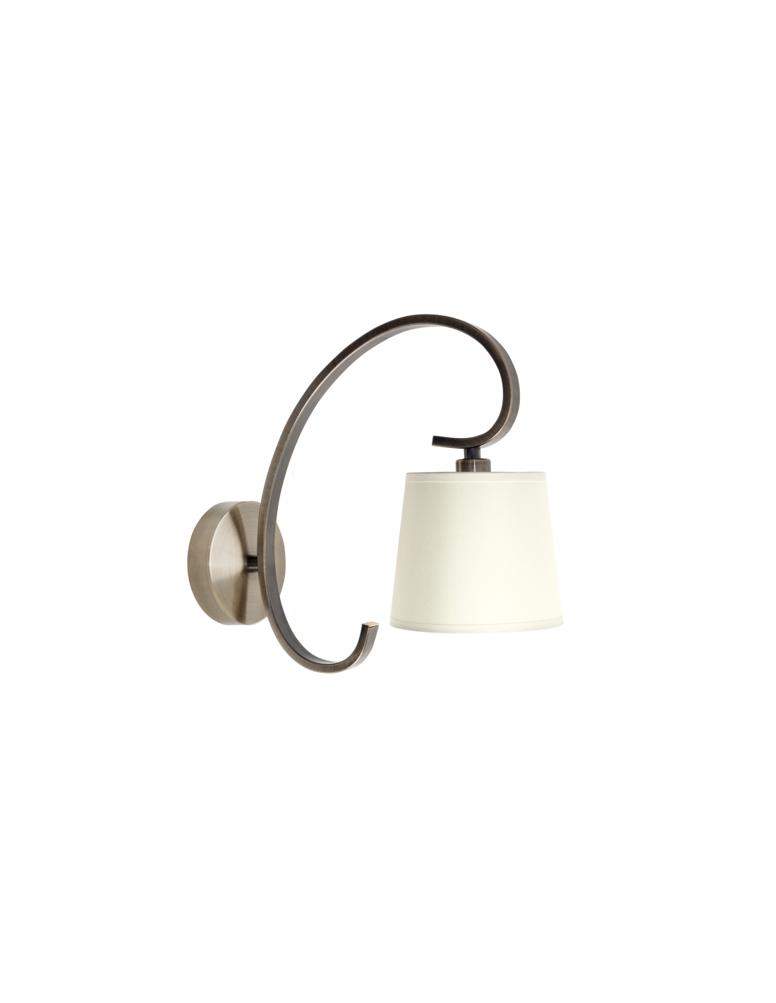 Aplique serie Concordia de color cuero con pantalla beis. Está realizado en metal, cristal y material textil. Sus dimensiones son 35x15x32 cm. Presenta un cuerpo curvo con una pantalla de forma cónica. El portalámparas es E14. Está disponible también el sobremesa, lámpara de ocho luces, cinco luces y tres luces en color cuero.