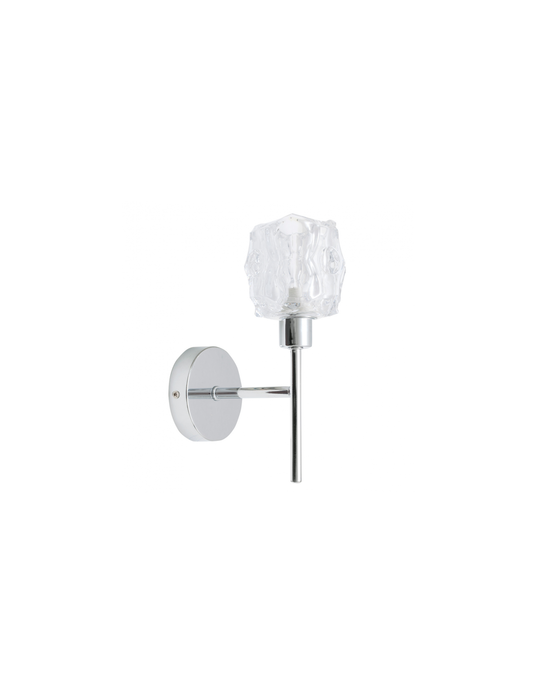 Aplique serie Derby de color cromo. Realizado en metal, con tulipa de cristal tallado que destaca por la singularidad que aporta al conjunto. La familia puede completarse con el sobremesa y lámparas de tres y dos luces en color cromo Disponible también en color cuero, excepto el aplique. El portalámparas es E14.