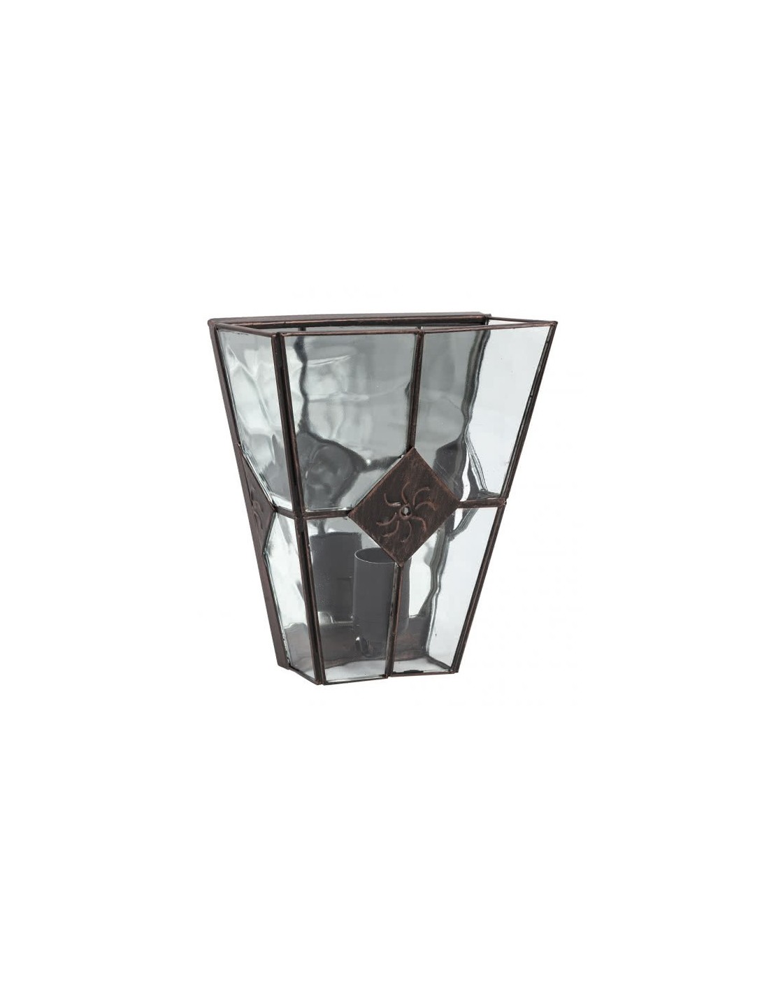 Aplique de la serie ESTEPA realiado en metal color cobre envejecido y cristal rugoso. Contiene un portalámparas E27. Sus medidas son 25x20x12 centímetros y su peso neto es de 1030 gramos.