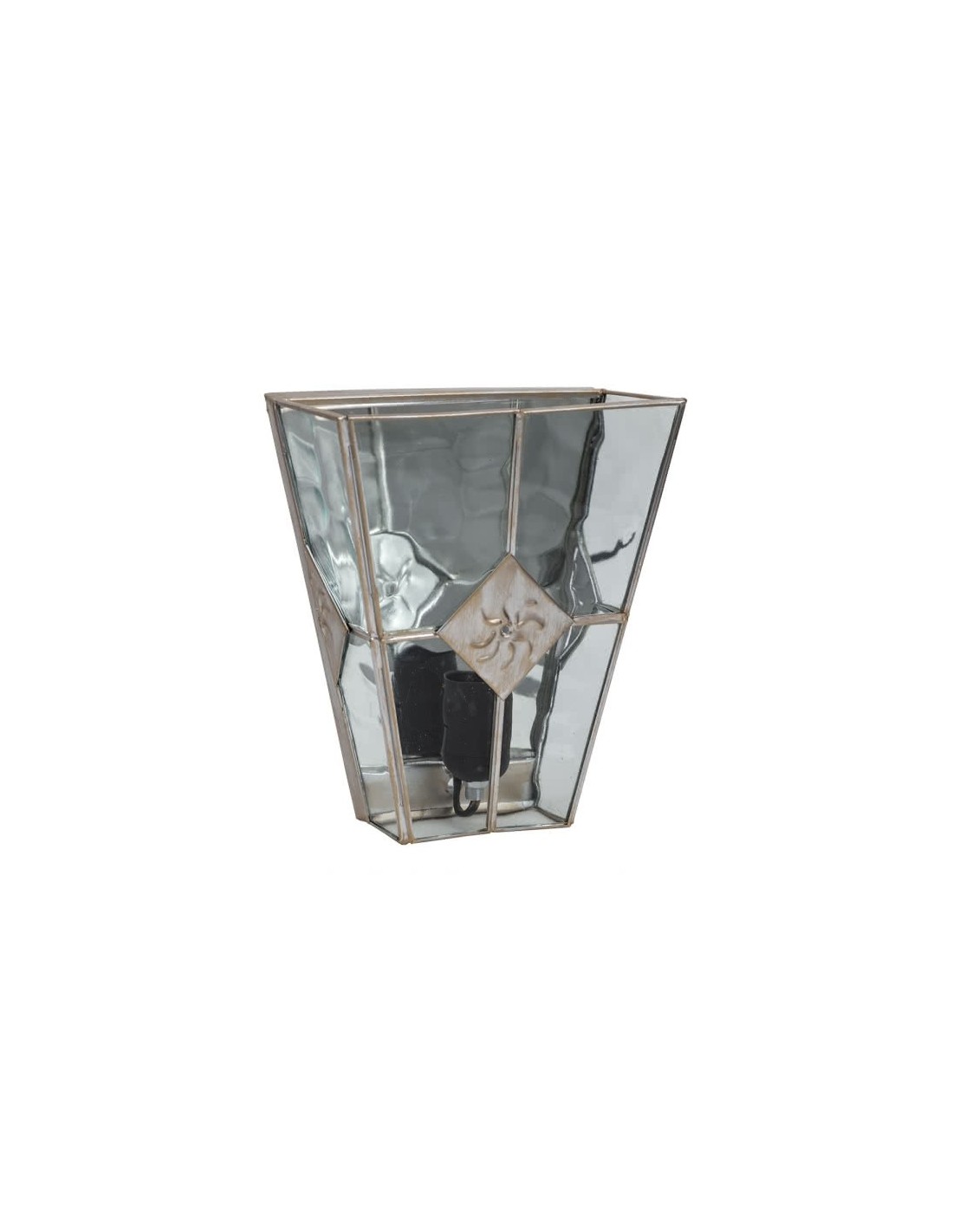 Aplique de la serie ESTEPA realiado en metal color oro y cristal rugoso. Contiene un portalámparas E27. Sus medidas son 25x20x12 centímetros y su peso neto es de 1030 gramos.