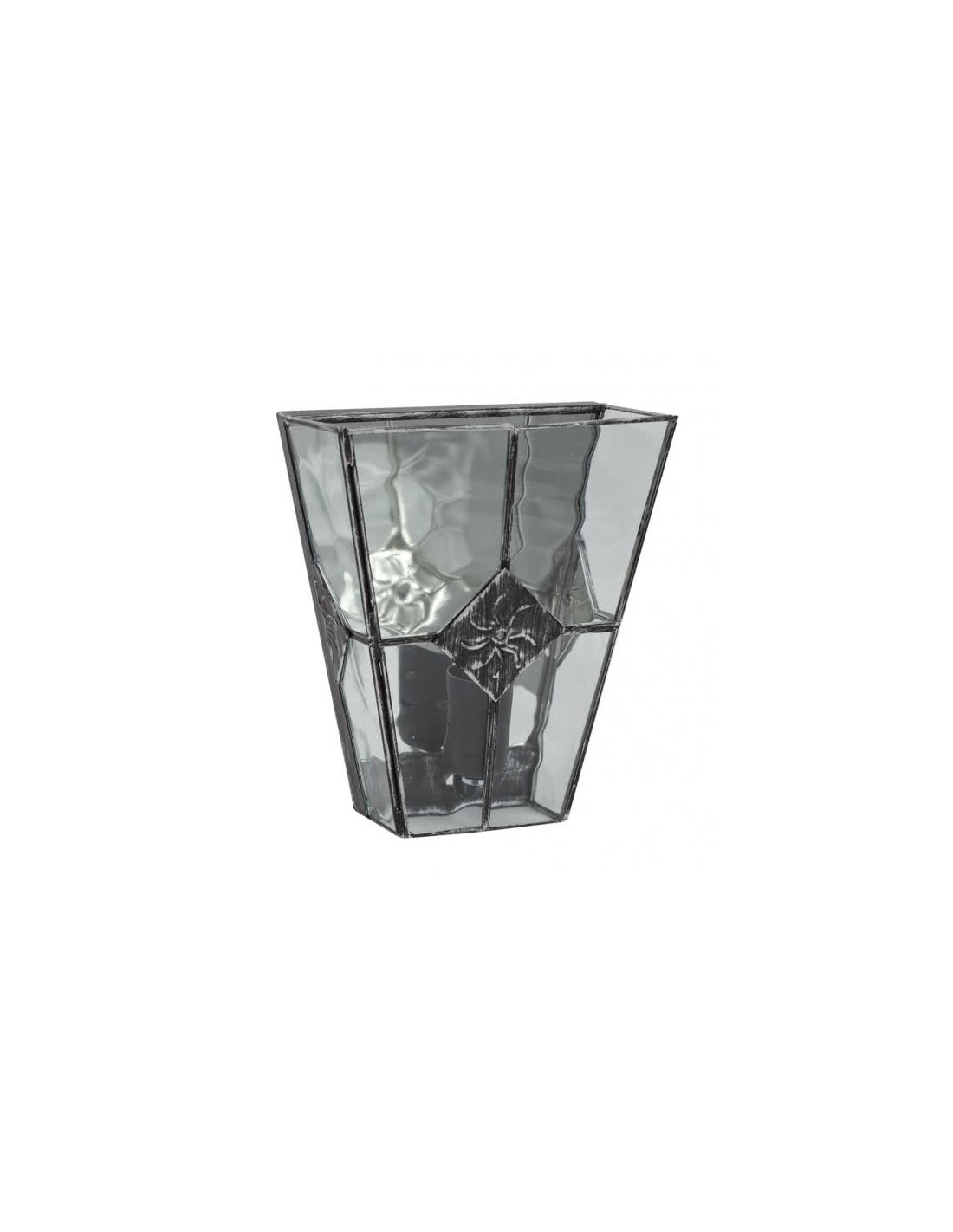 Aplique de la serie ESTEPA realiado en metal color plata envejecida y cristal rugoso. Contiene un portalámparas E27. Sus medidas son 25x20x12 centímetros y su peso neto es de 1030 gramos.
