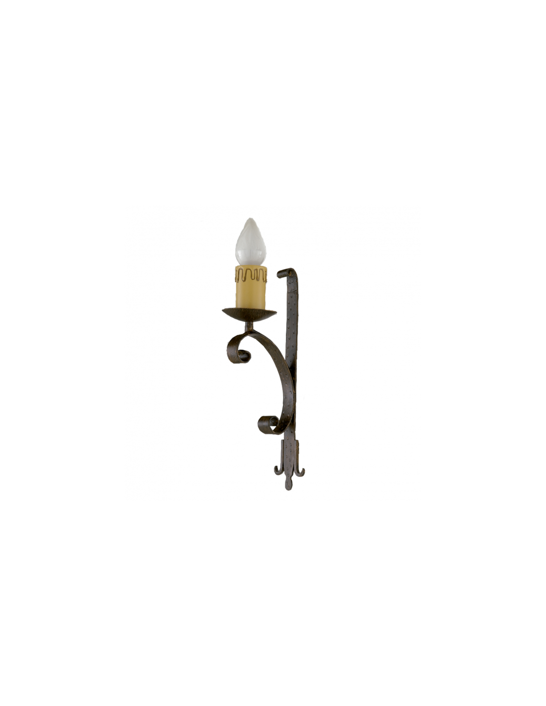 Aplique de una luz serie Rueda en color marrón. Realizado en metal y policarbonato. Utiliza dos portalámparas E27. Se recomienda bombillas Led en forma de vela para potenciar el diseño del aplique y conseguir un mayor ahorro en el consumo. El estilo rústico es ideal para casas de campo. Puede completar la serie con las lámparas de tres, cinco, seis luces y aplique de dos luz.