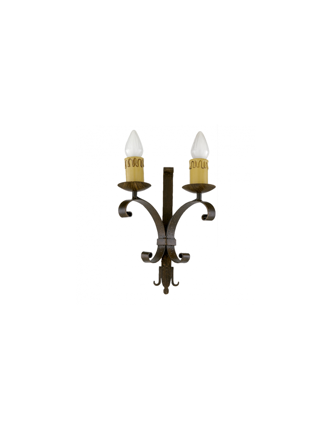 Aplique de dos luces serie Rueda en color marrón. Realizado en metal y policarbonato. Utiliza dos portalámparas E27. Se recomienda bombillas Led en forma de vela para potenciar el diseño del aplique y conseguir un mayor ahorro en el consumo. El estilo rústico es ideal para casas de campo. Puede completar la serie con las lámparas de tres, cinco, seis luces y aplique de una luz.