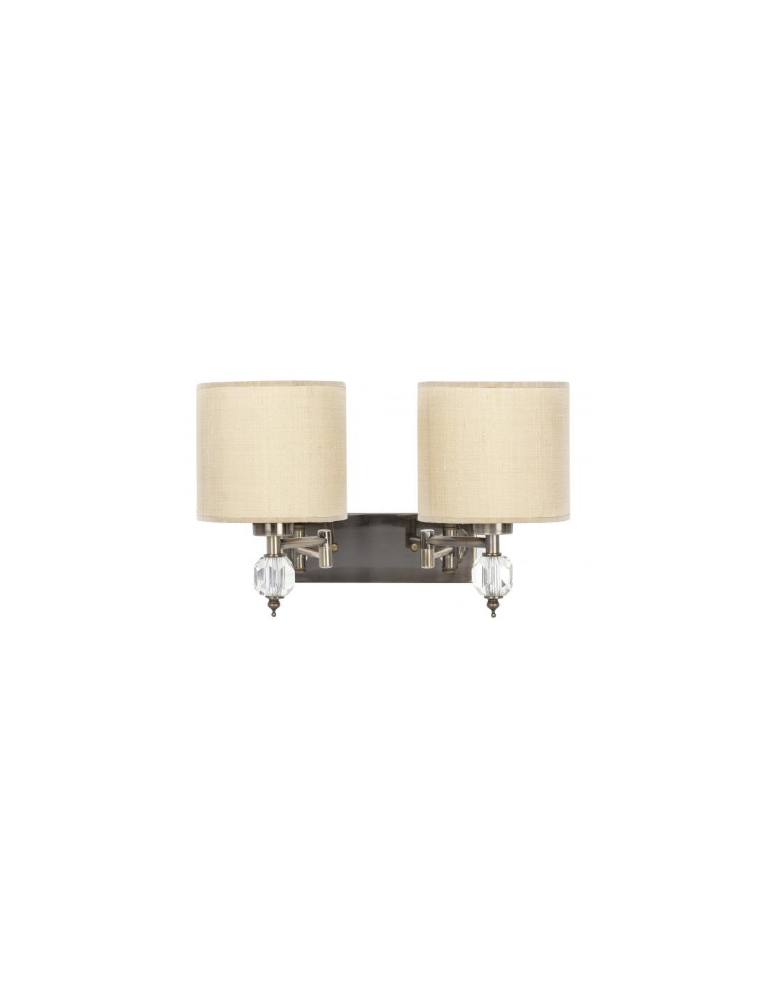 Aplique de dos luces serie San Miguel en color beis/cuero. Este elegante aplique combina el material textil y metal con detalles en cristal. Presenta un brazo articulable lo cual lo hace más funcional. Sus dimensiones son 16<,36x38x23 cm y su peso neto 1030 gr. Utiliza dos portalámparas E27. Puede completar la iluminación de su hogar con la serie completa en color cuero.
