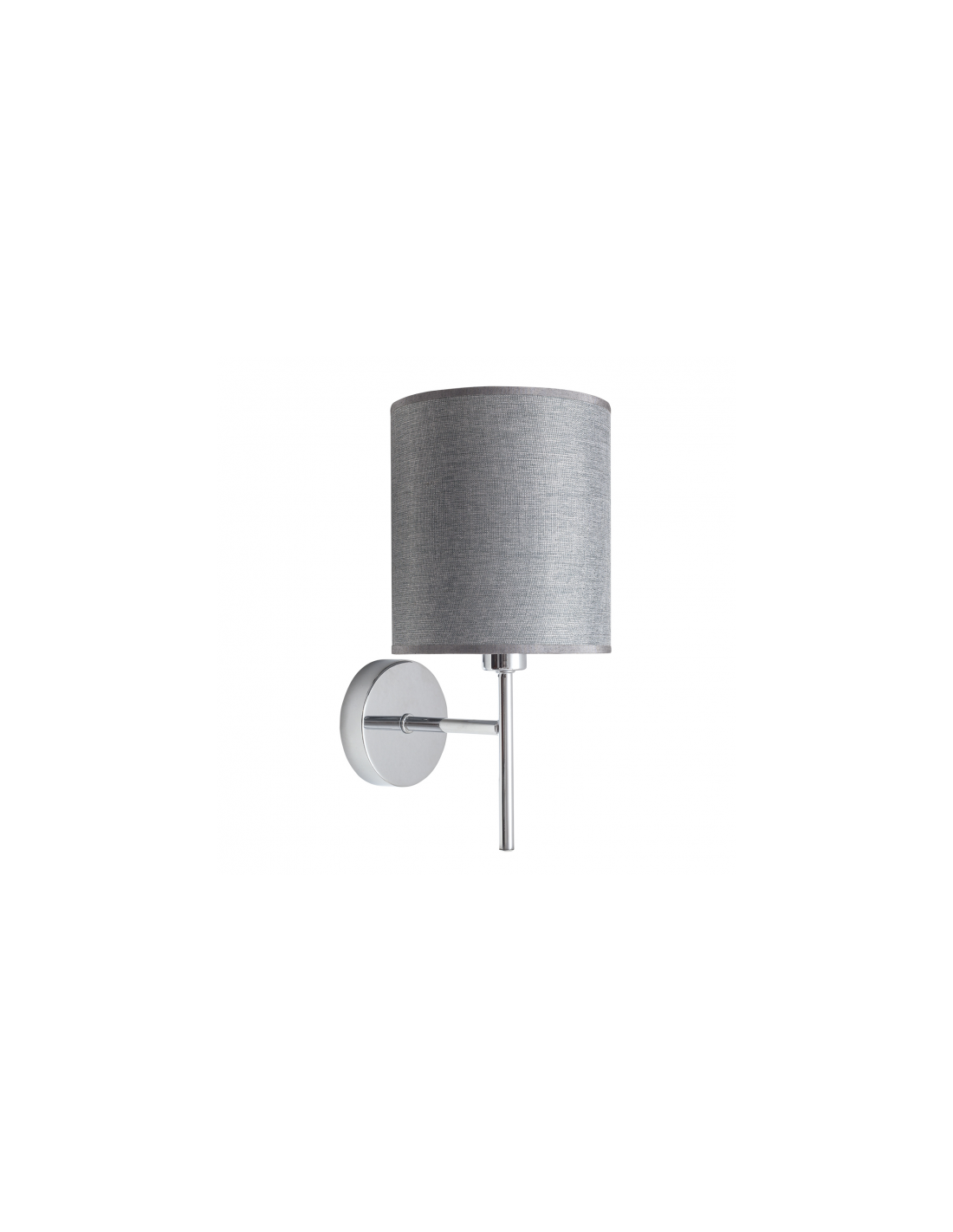 Aplique serie Axel de color plata. Este aplique forma parte de una familia muy completa de colgantes de varias medidas sobremesa y pie de salón. Está realizado en metal de color cromo y pantalla textil de color plata. Sus dimensiones son 33x16x21 cm y su peso neto 325 g. El portalámparas es E14.