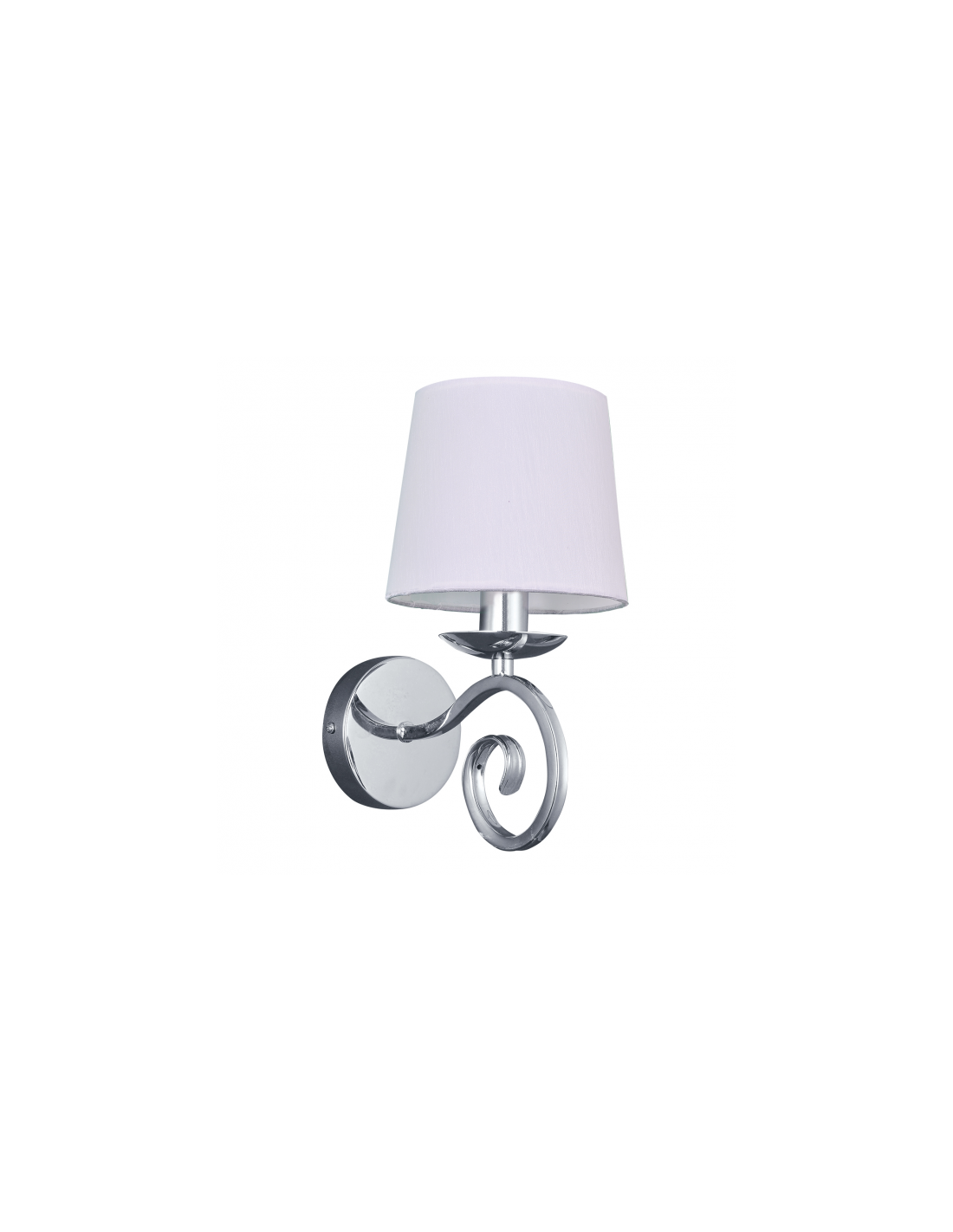 Aplique serie Veracruz de color cromo y pantalla blanca. Está realizado en metal y material textil. El cuerpo presenta una forma de voluta sobre la que descansa la pantalla. Sus dimensiones son 30x20x15 cm y su peso neto 400 g. El portalámparas es E14. Está disponible en color cuero con pantalla beis. Puede completar la familia con el sobremesa, pie de salón, lámpara de tres, cinco y seis luces en color cromo.