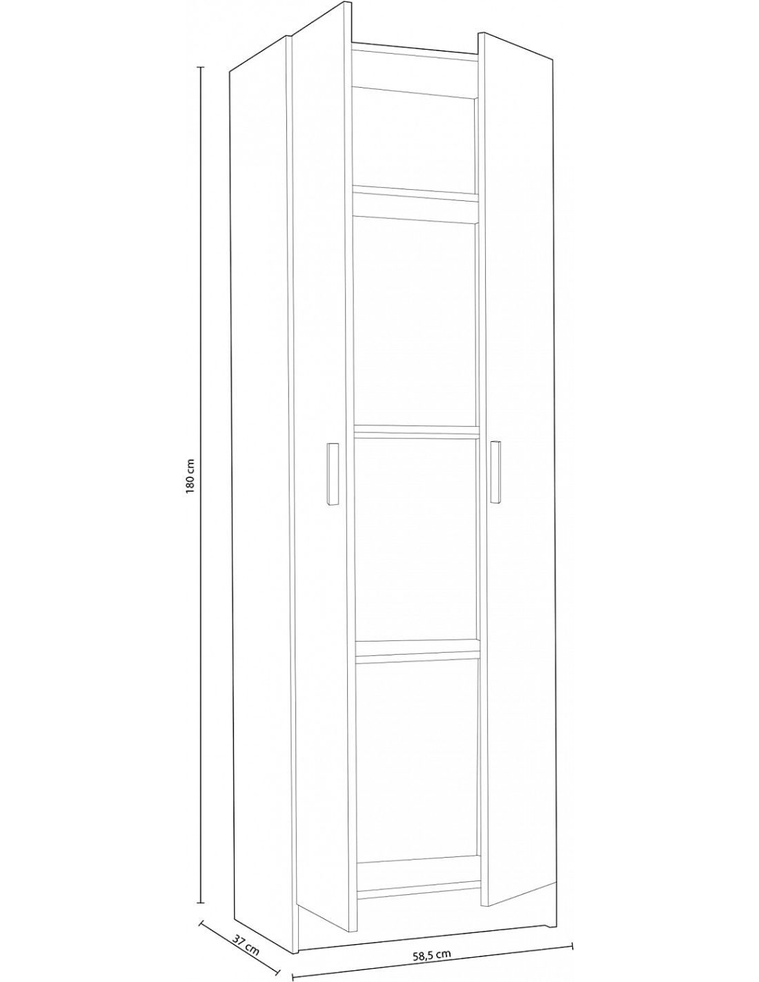 Armario de 2 puertas con 3 estantes regulables en altura. Está fabricado con melaminas de 15 mm. de espesor. La trasera del mueble es de madera de 3 mm. Bisagras metálicas.