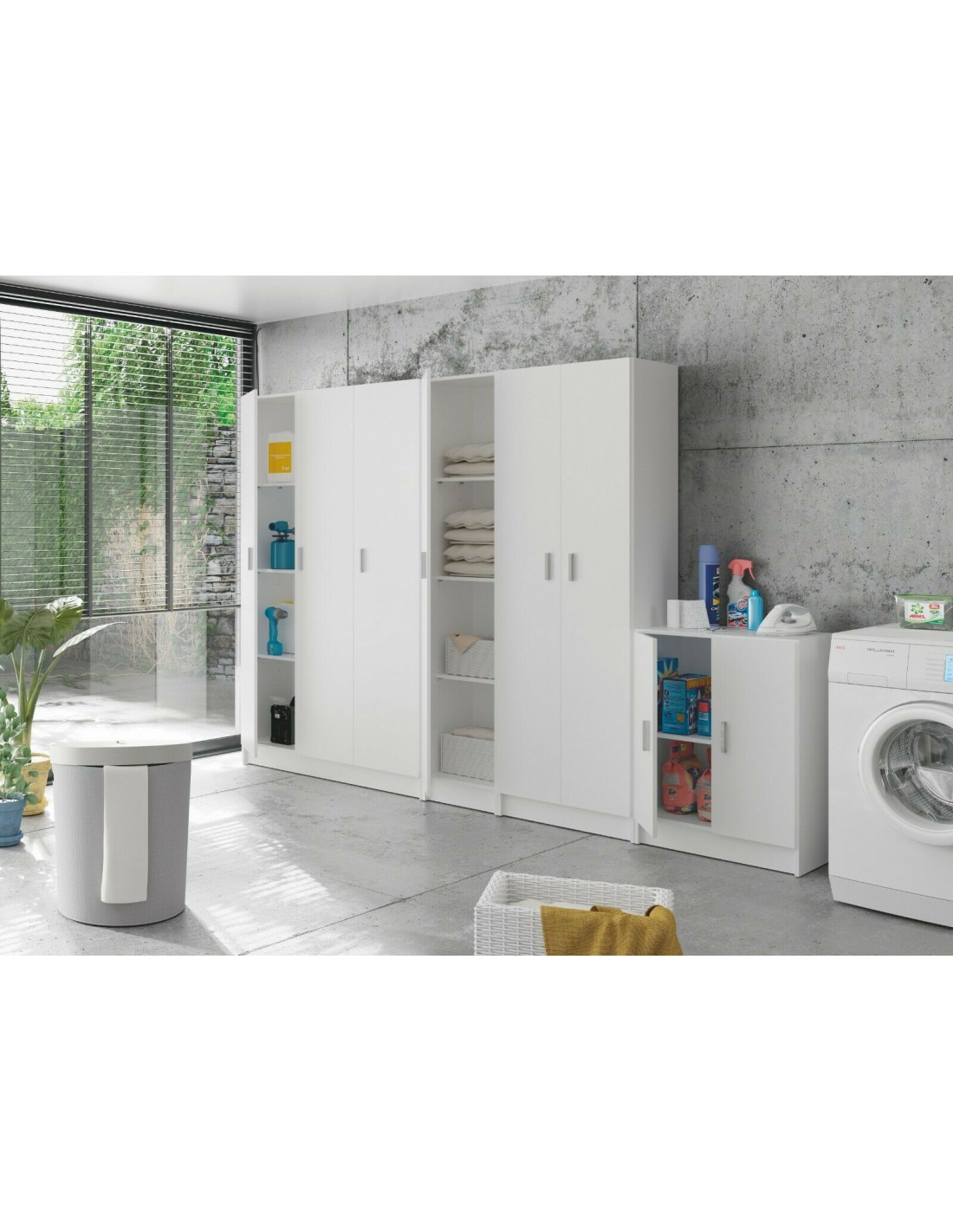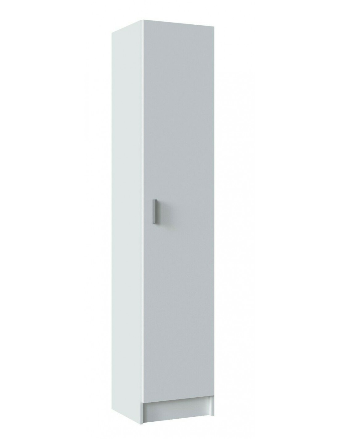 Armario de 1 puerta con 3 estantes regulables en altura. Está fabricado con melaminas de 15 mm. de espesor. La trasera del mueble es de madera de 3 mm. Bisagras metálicas. Soporte estantes metálicos. Tacos ABS quitarruidos y antirayas para la parte inferior del mueble.