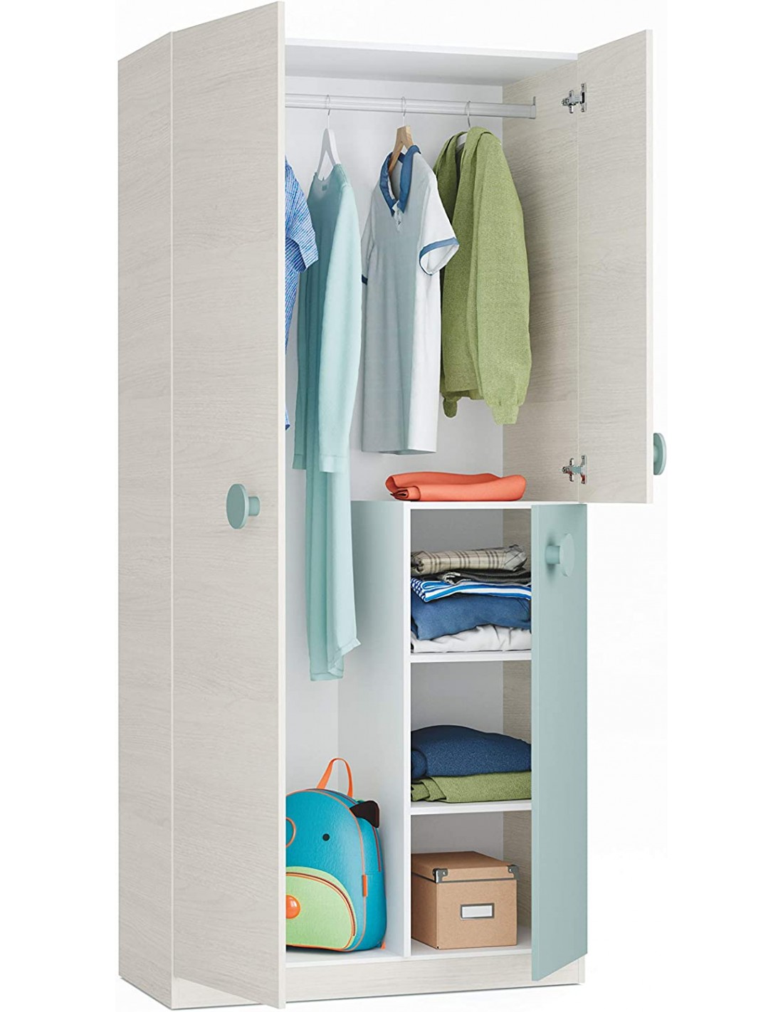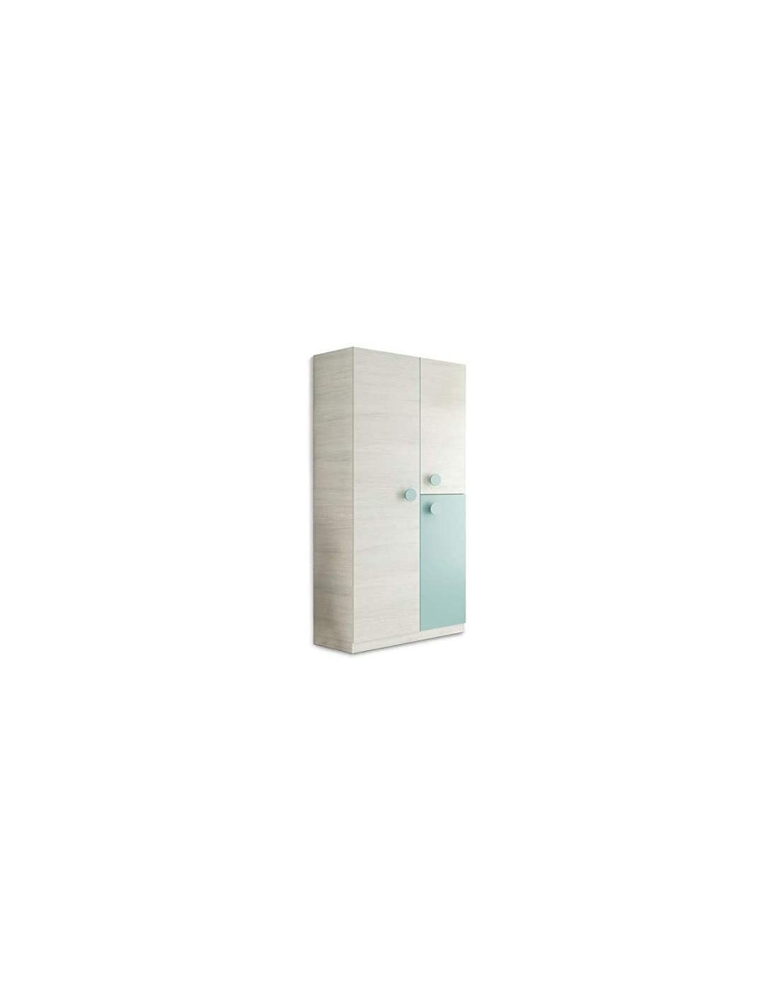 El armario ropero blanco para dormitorio juvenil SNUBA se presenta en un bonito diseño en blanco Alpes y verde Acqua. Tiradores redondos en color verde.
