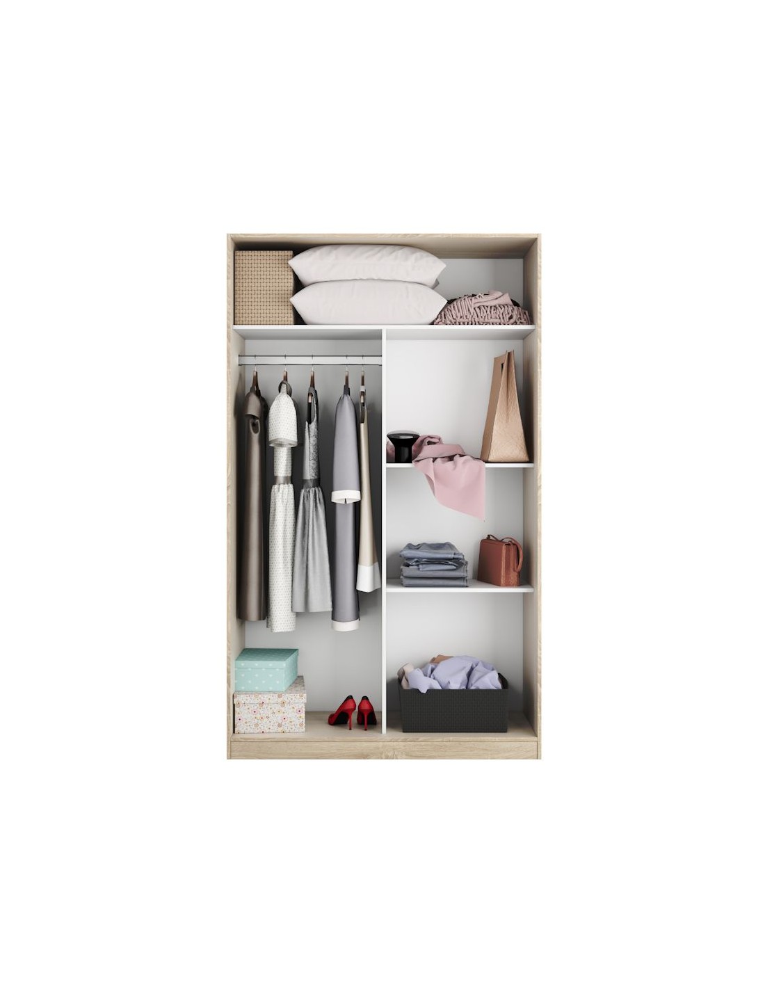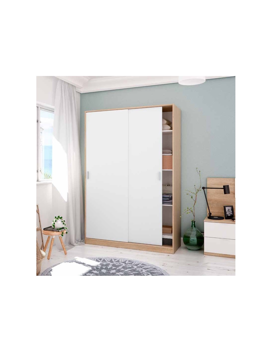 Armario de 2 puertas correderas con barra de colgar y 3 estantes en su interior. Barra de colgar aluminio extraíble. Guías correderas ABS para las puertas.