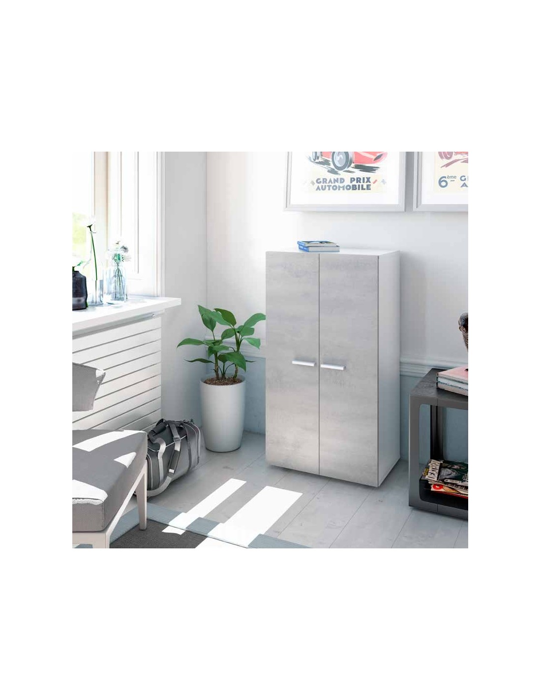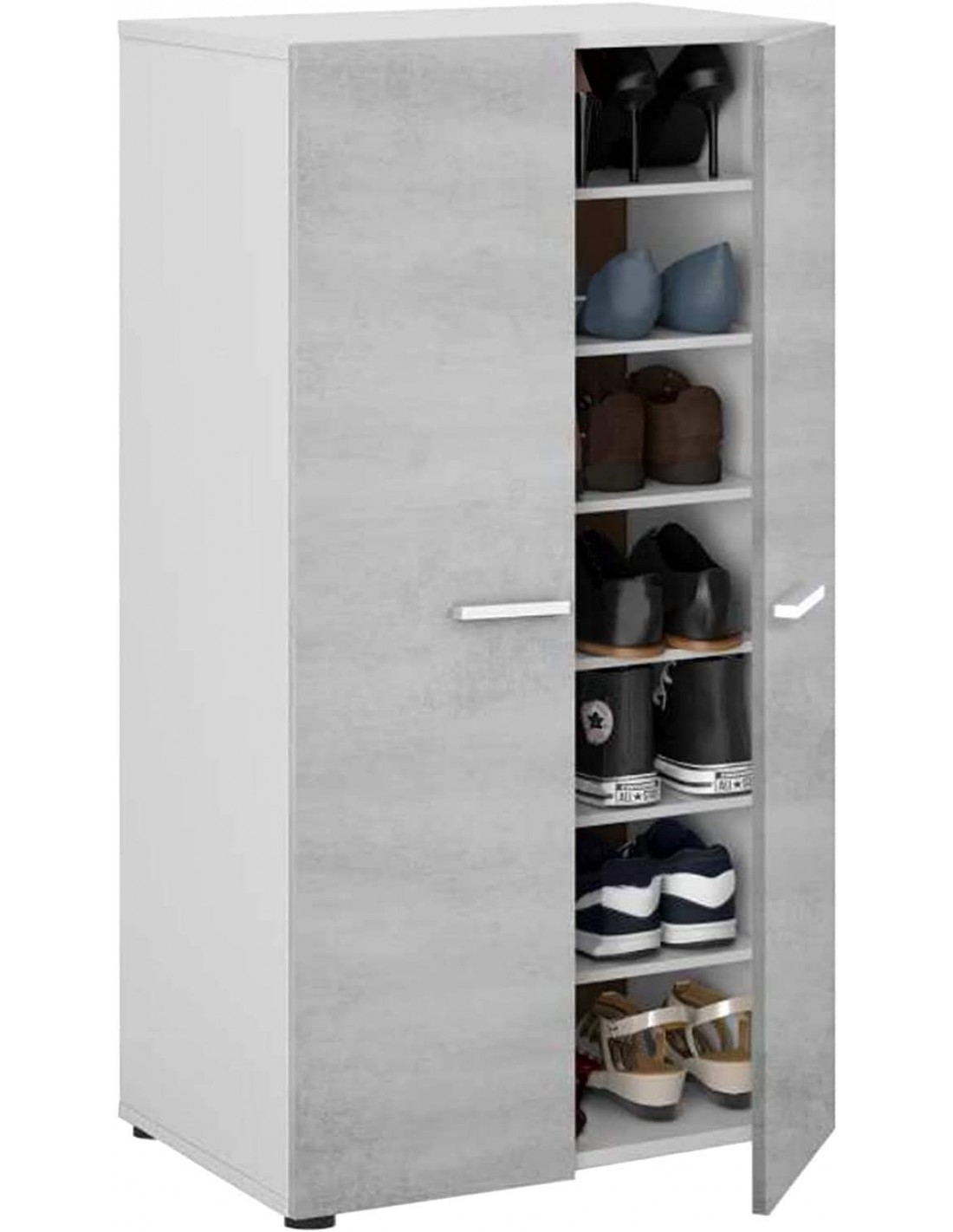 Zapatero modelo Cloe, tiene 2 puertas y 6 baldas. Es de color cemento y tiradores de color blanco.