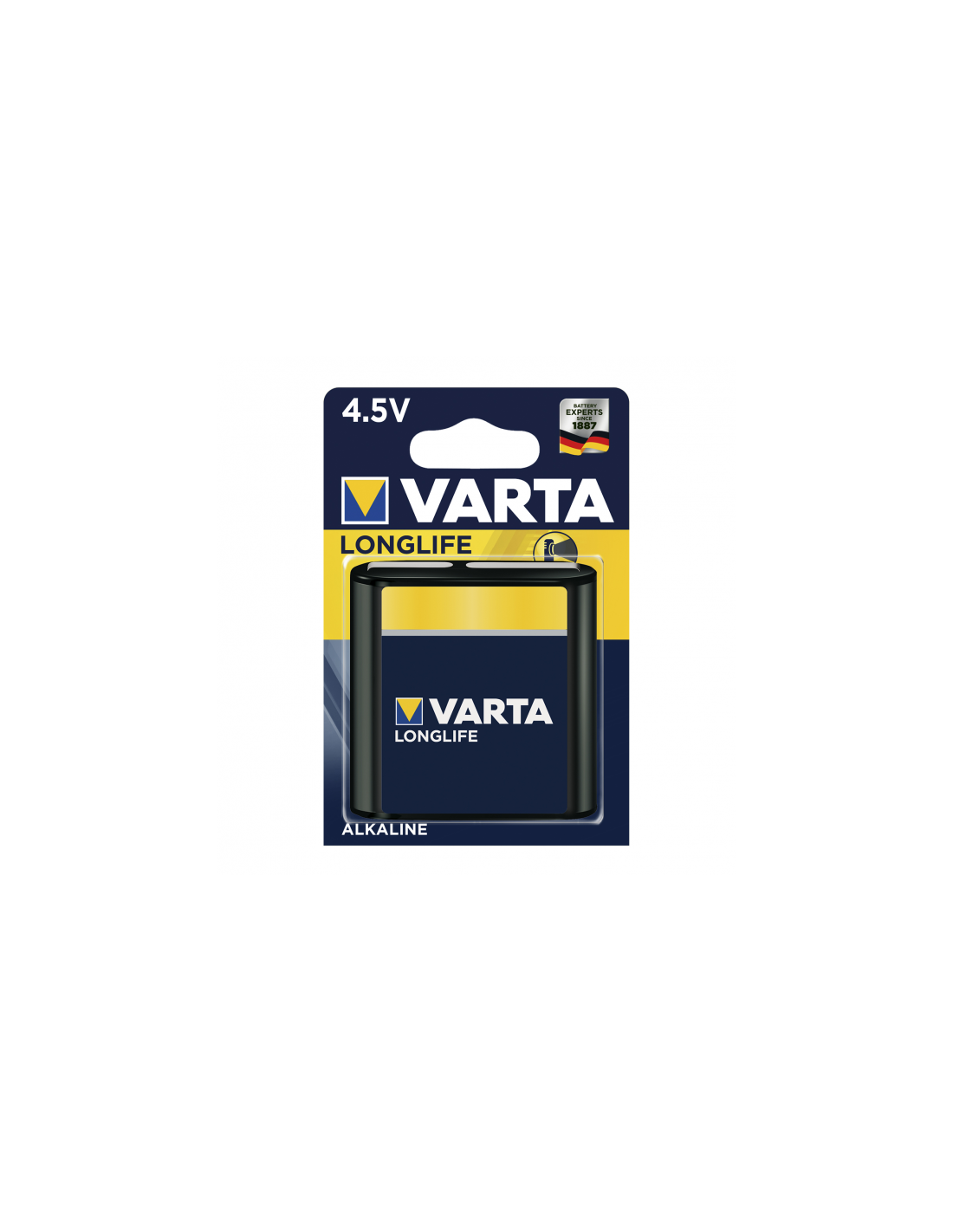 Blister de una Pila AlcalinasVarta Longlife modelo 3LR12 y 4,5v. Energía duradera para dispositivos que consumen poca energía pero de un modo constante, por ejemplo linternas planas.