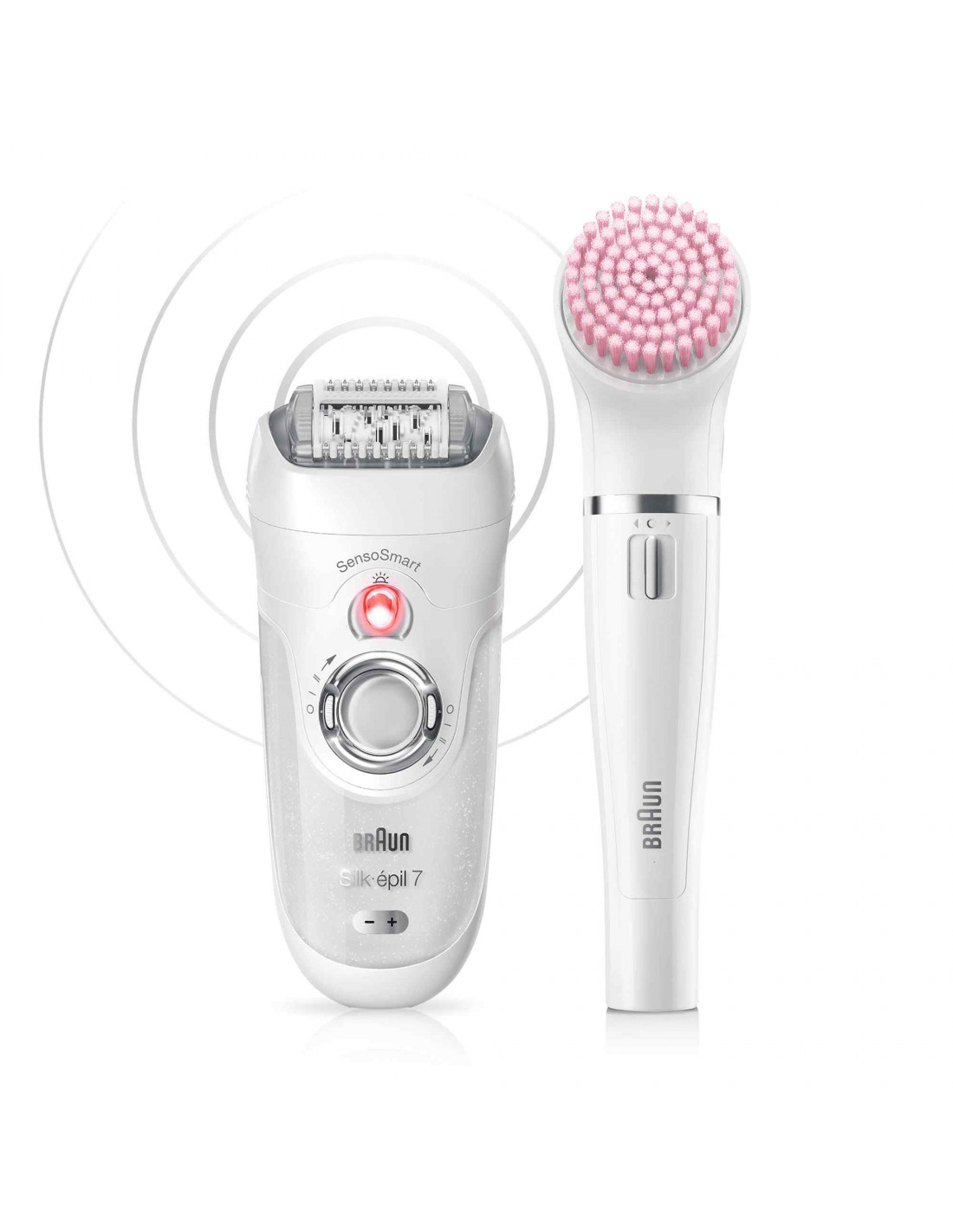 BRAUN Depiladora Silk Epil recargable 5 en 1, 7-775 Beauty Set SensoSmart, 40 pinzas, cabezal pivotante, Luz smartlight, incluye cepillo facial, cepillo exdfoliante, esponja
