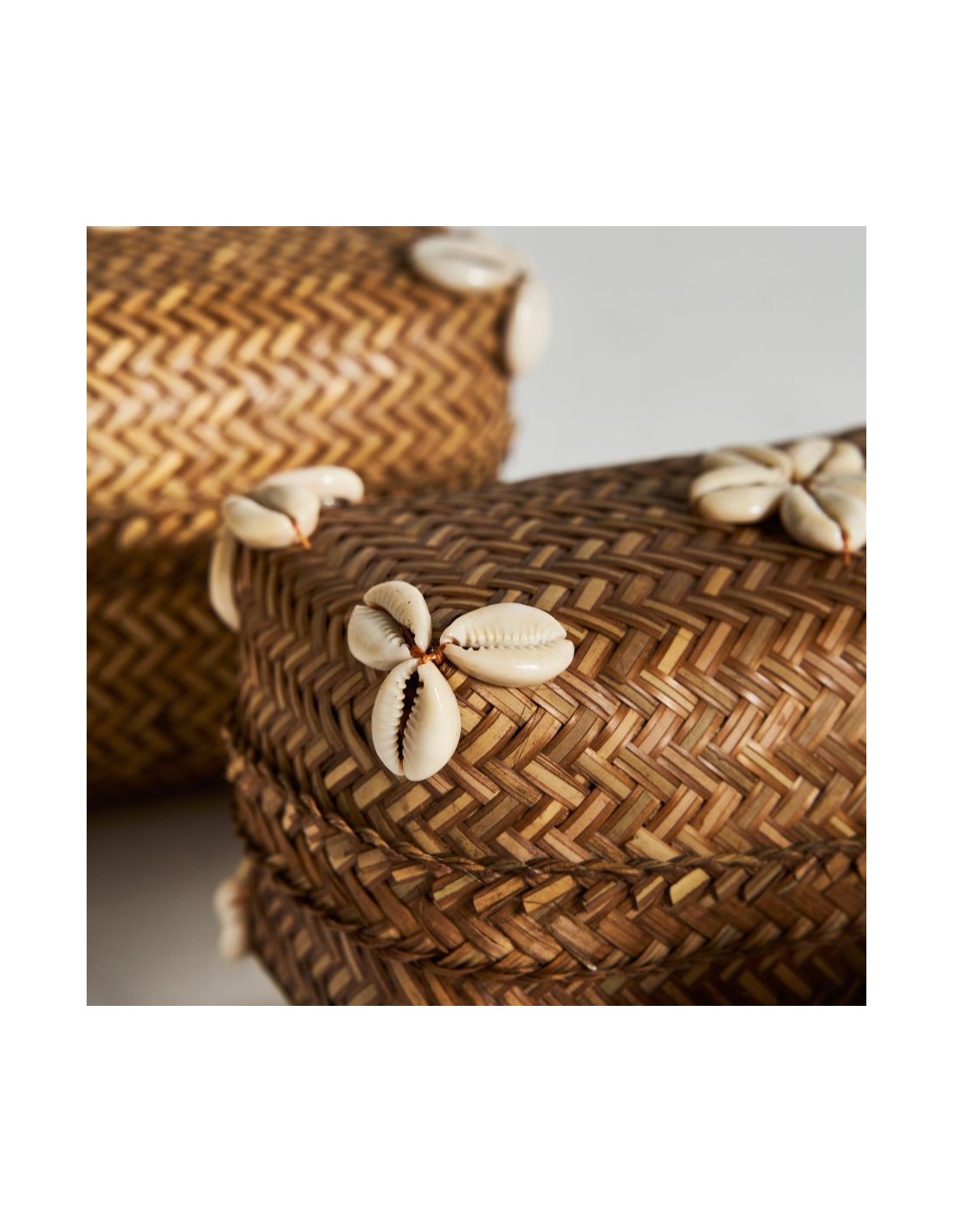 Caja J/3 Rectangular Caracolas, En Color Natural, De Estilo Nórdico. Fabricado En Ratán, Combinado Con Concha.