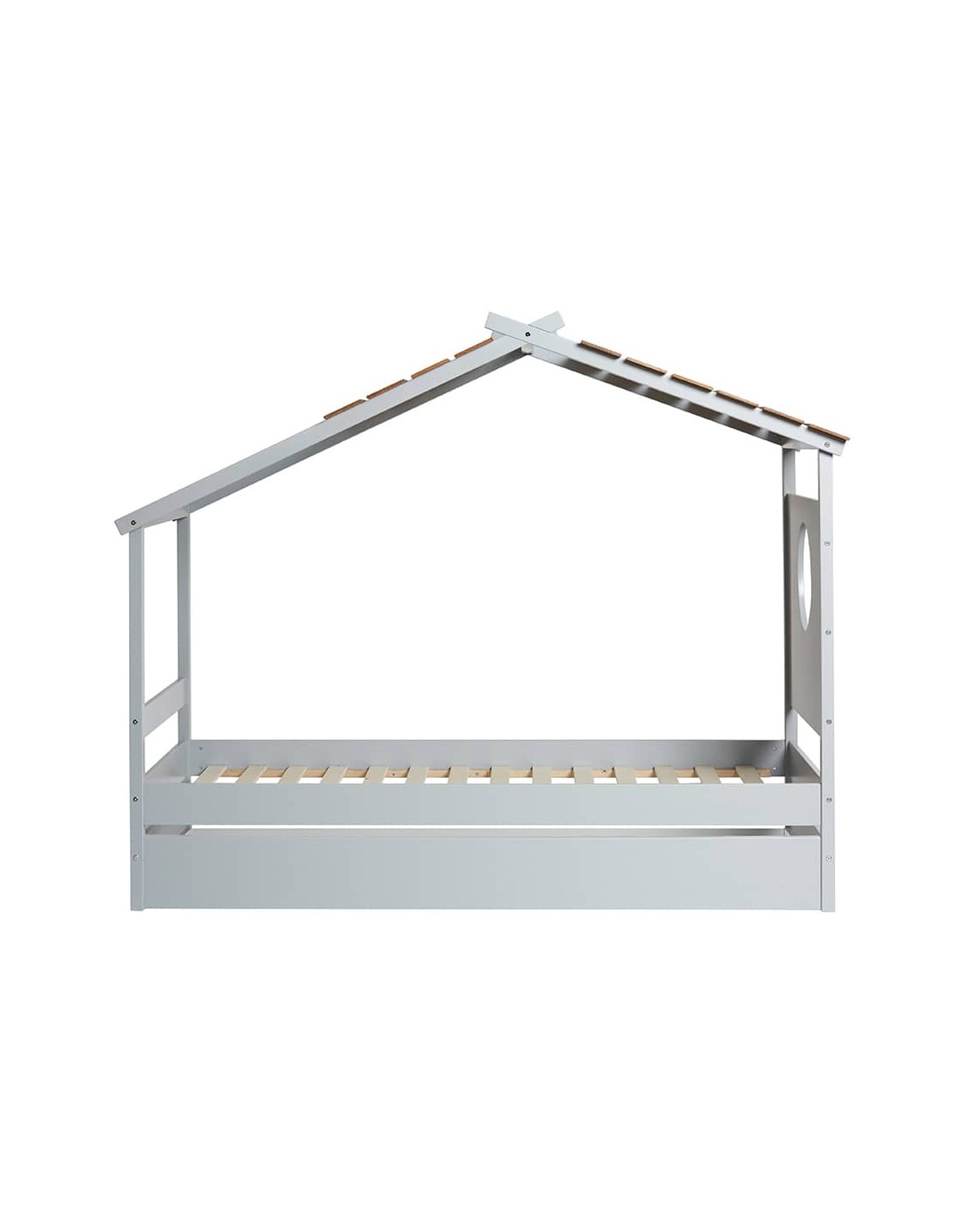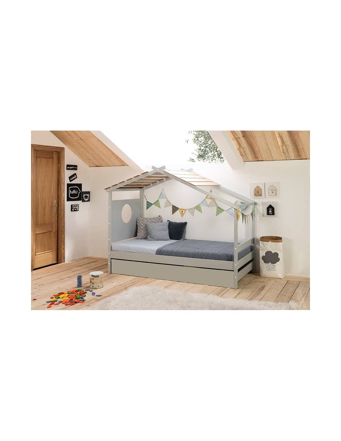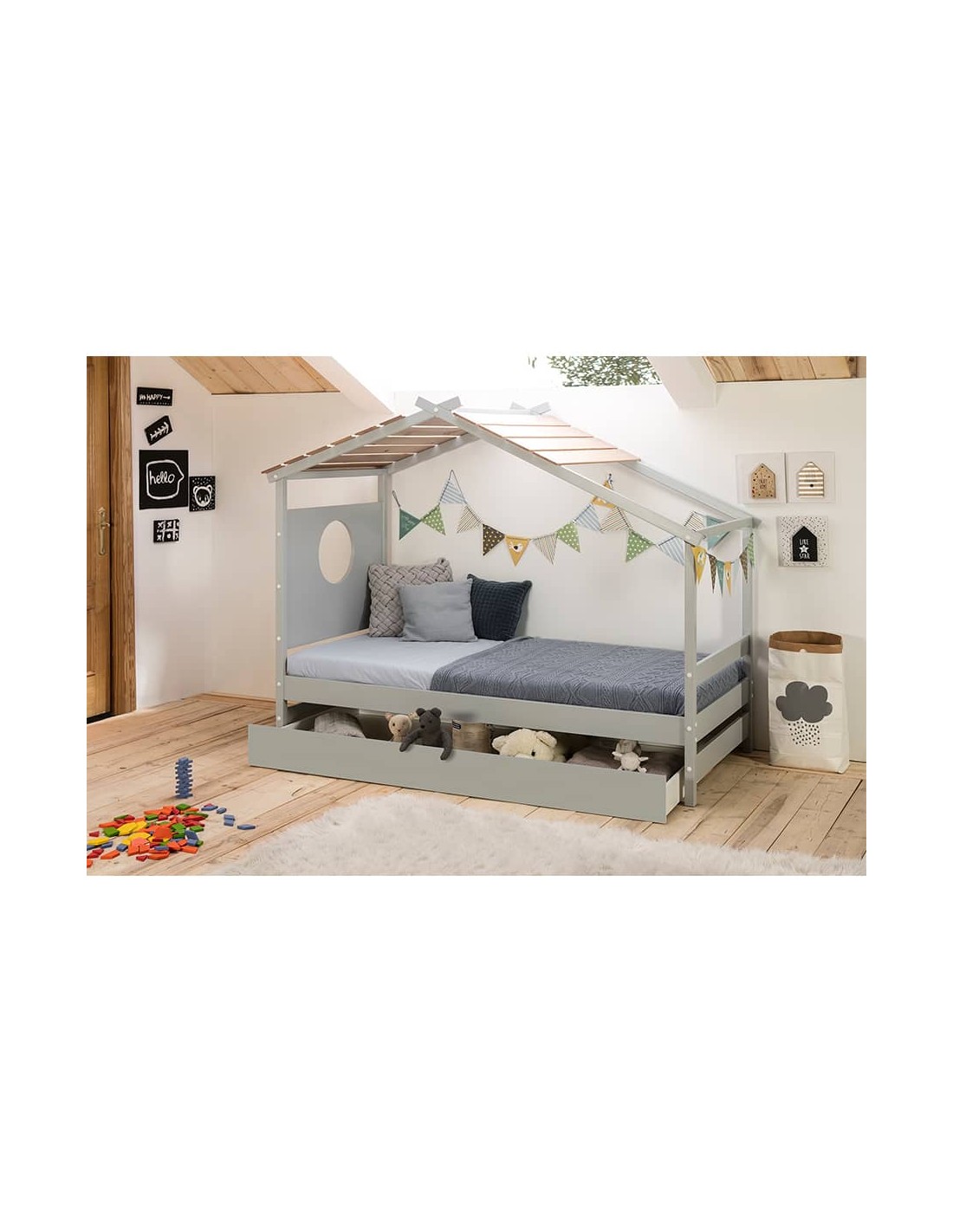 Esta cama cabaña es una cama robusta y resistente con tejado que otorga un espacio intimo y mágico para los peques. Dispone de cajón para almacenar sábanas, peluches, juguetes, etc...