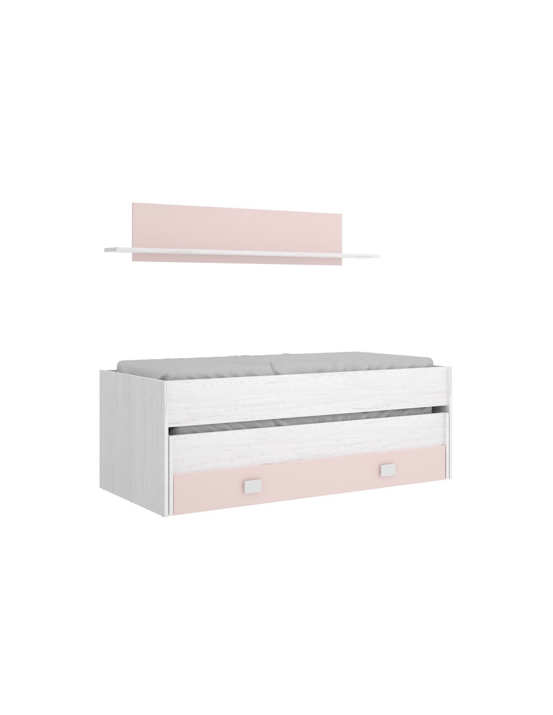 Cama compacto juvenil de dos camas y cajón grande, más una estante a pared, acabado en roble blanco y azul, moderno y versátil de lineas nórdicas muy actual.