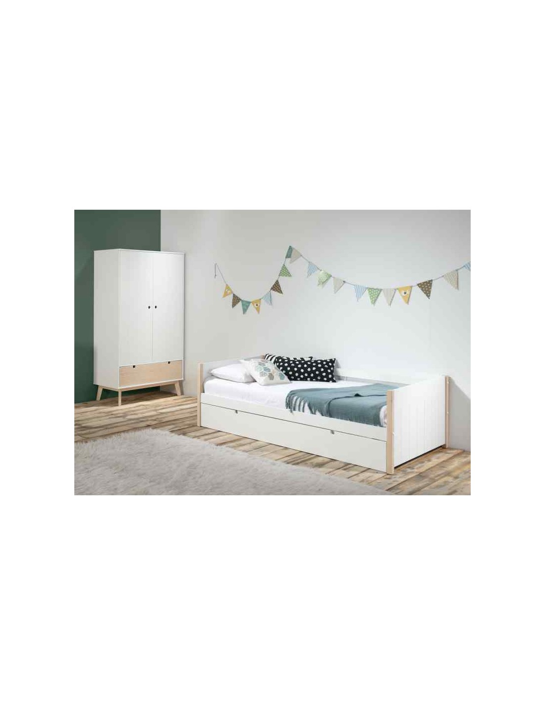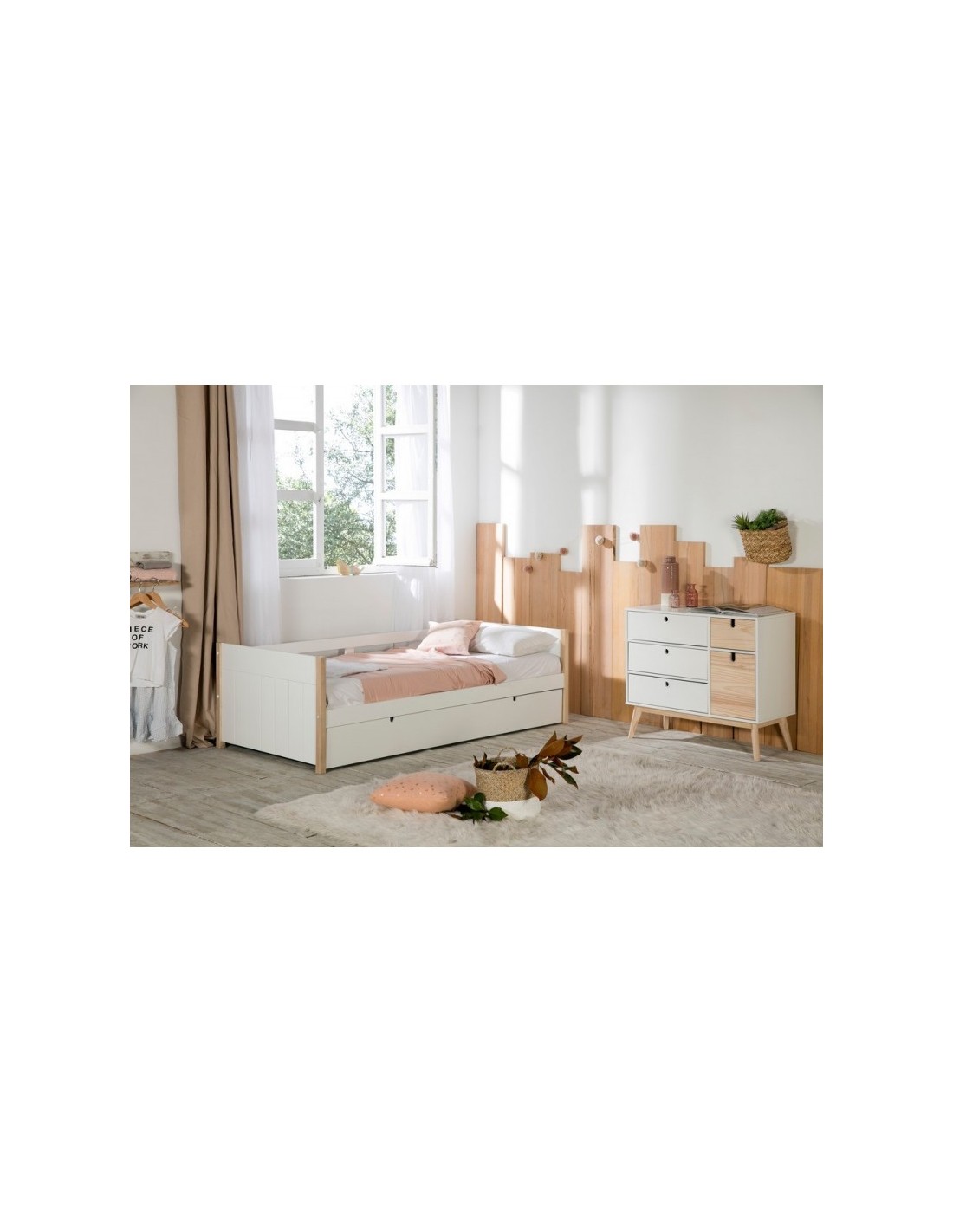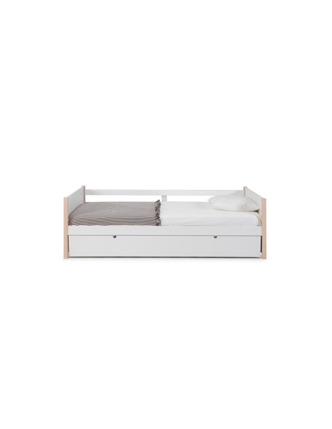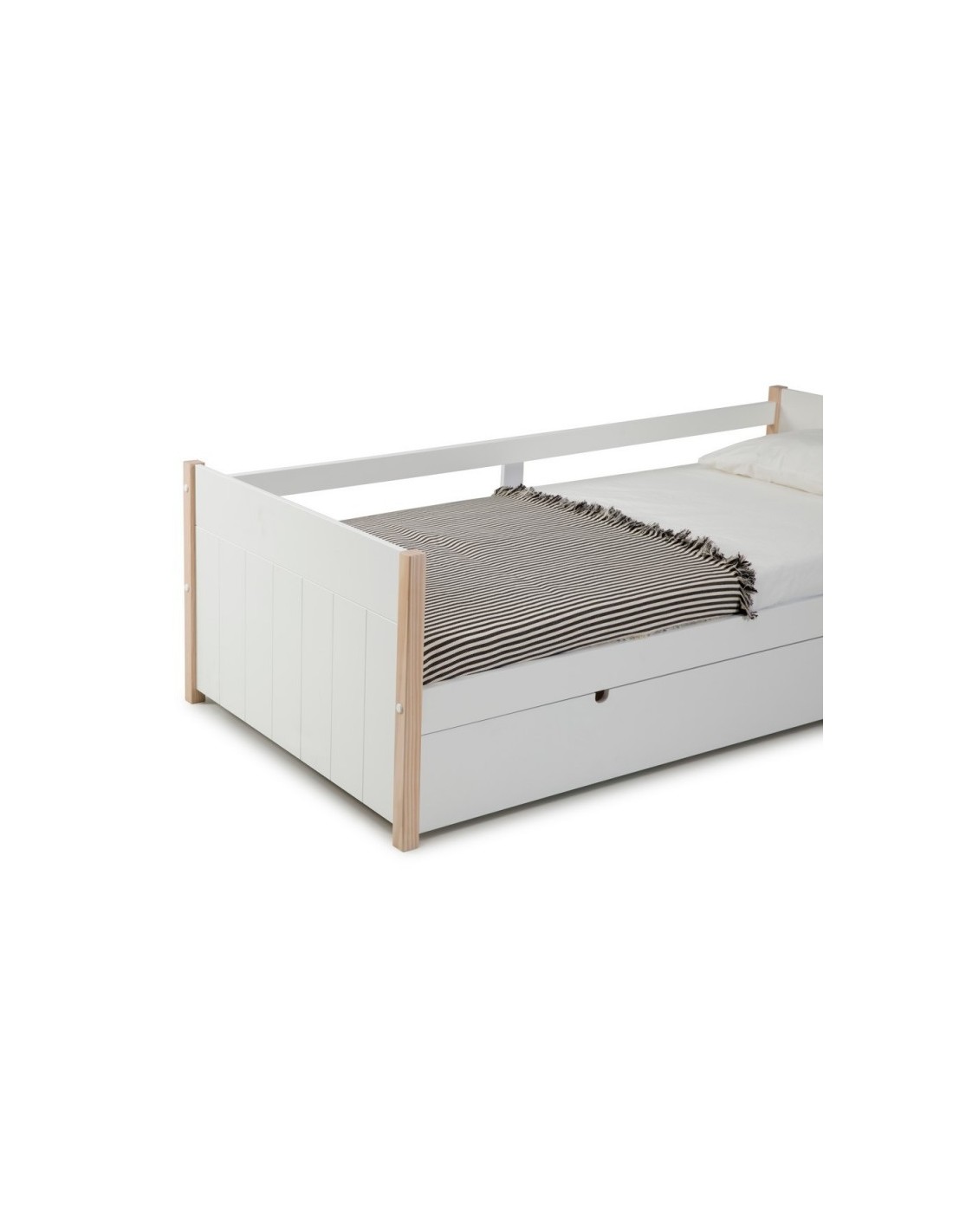Cama nido para colchón de 90 x 190 cm. con cajón arrastre para cama supletoria acabado en blanco y madera natural a la cera.