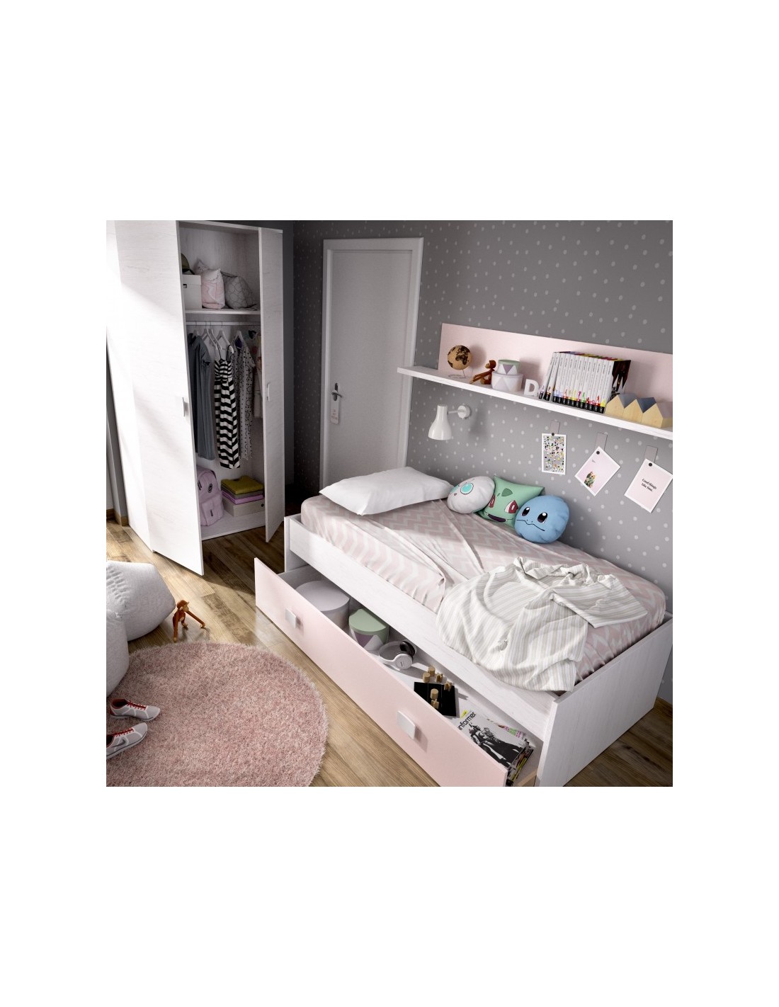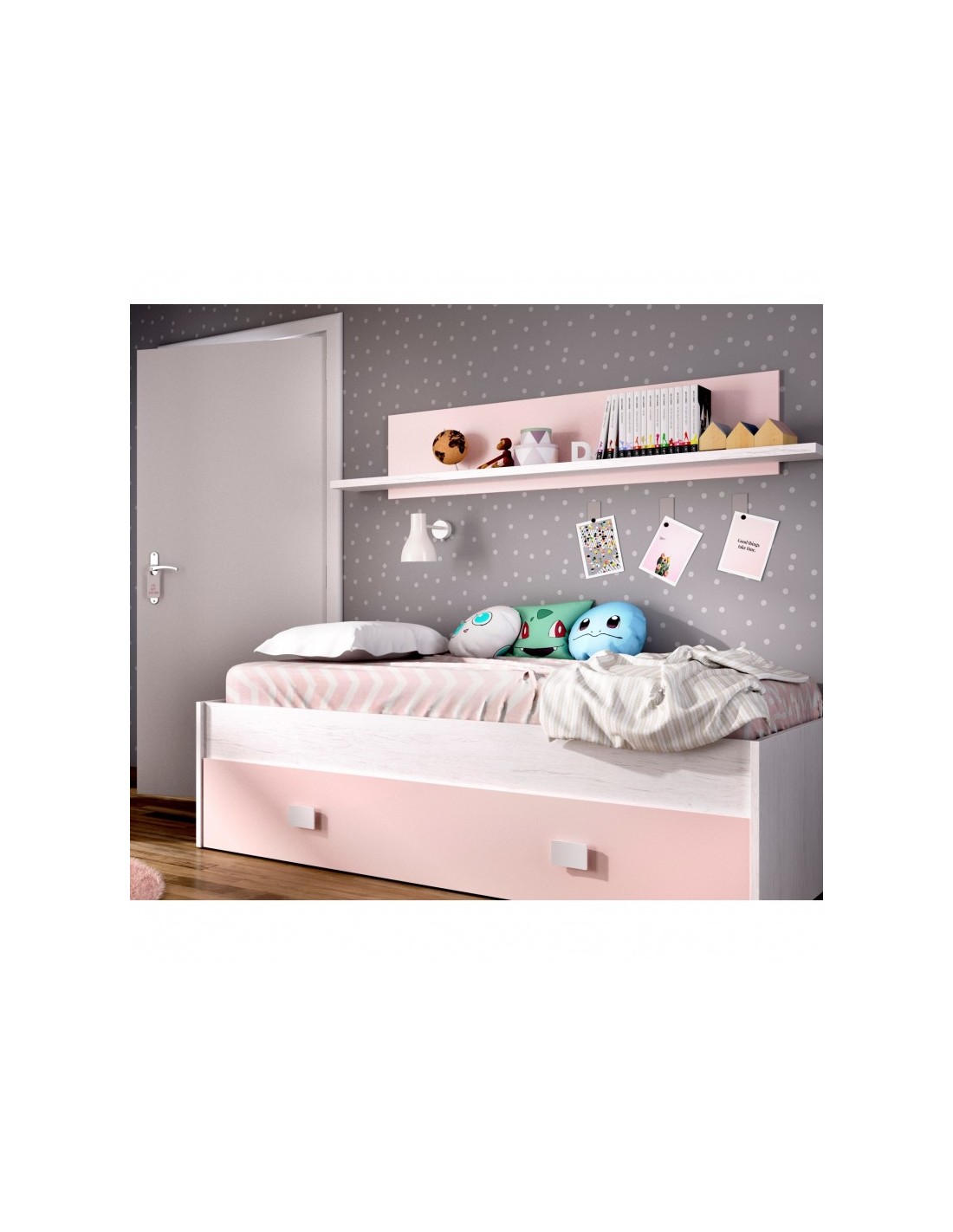 Cama Nido Rosa y Blanco + Cajón + Estante de Pared