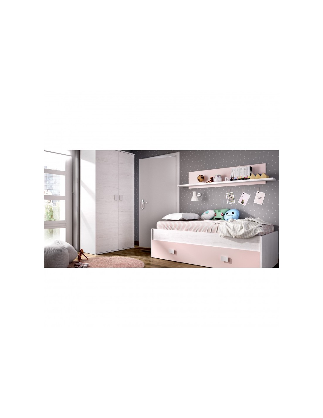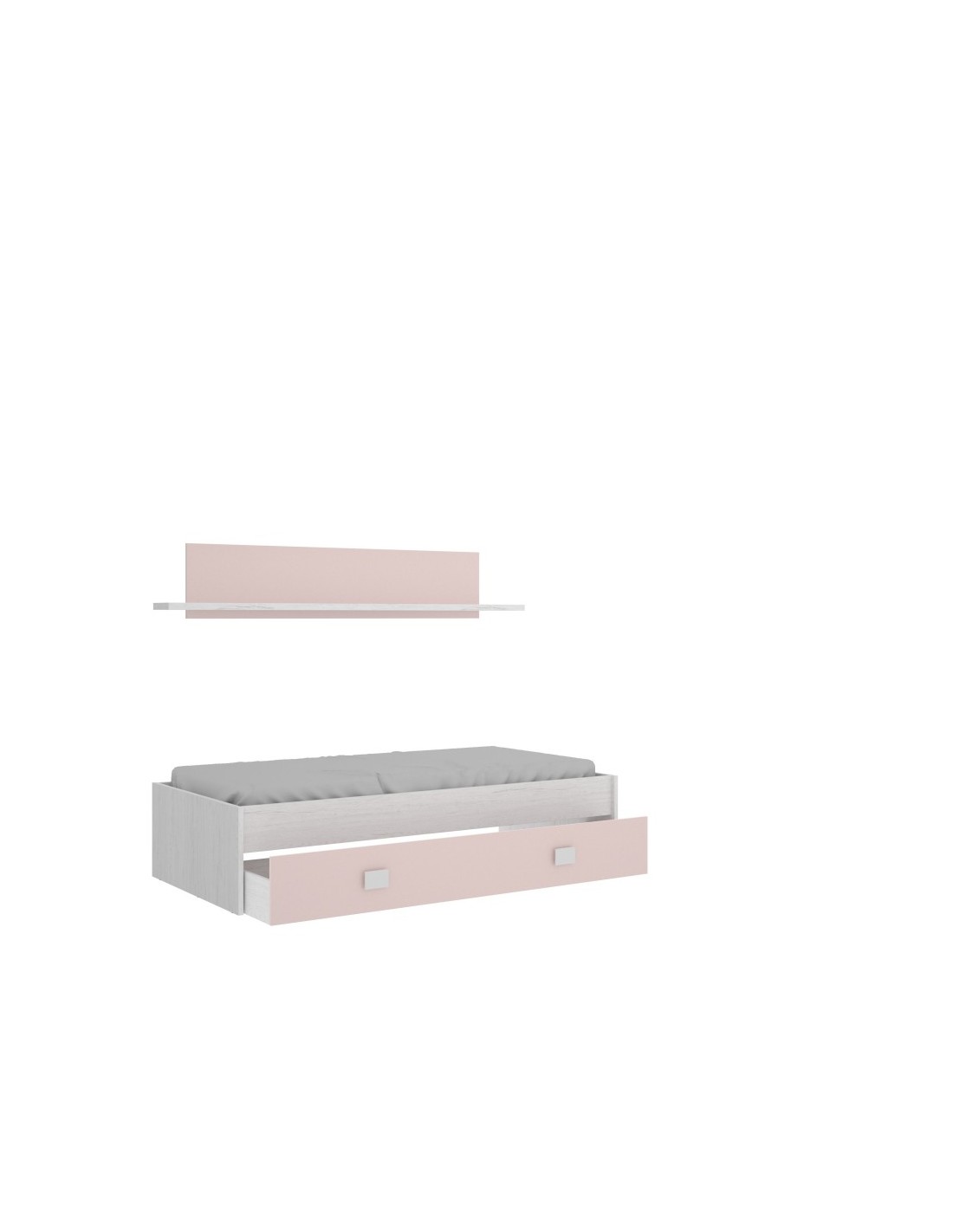 Composición infantil de cama nido con un cajón grande y un estante a pared, realizado en tablero Laminado de alta calidad de 16 /22 mm. de grosor y acabado en roble blanqueado imitando la veta de la madera y rosa en el frente del cajón grande y el mural del estante a pared.