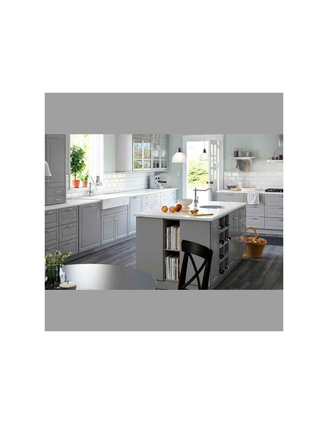 Cocina blanca plafon elegante lacada polilaminado gris topo arenada isla