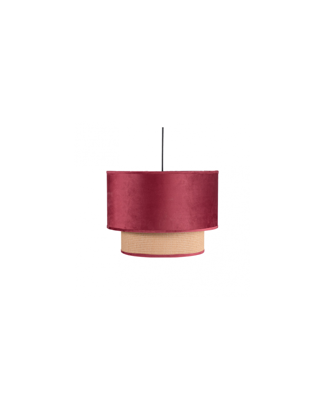 Colgante de diseño con dos pantallas serie NERVA combina pantalla de terciopelo de color ROJO VINO y con pantalla color nea, de estilo moderno. Tiene 40 cm de diámetro con unas dimensiones, de altura regulable, 72X40X40 centímetros. Contiene un portalámpara E27. Bombilla no incluida. Tiene un peso NETO de 840 gramos. También disponible en Ver Rojo Vino y Azul.