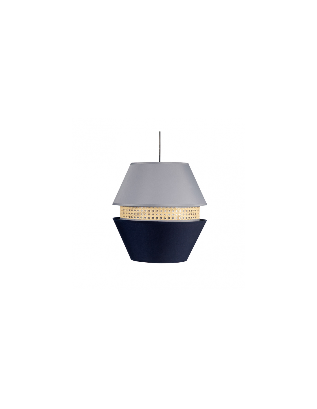 Colgante serie TRAJANO de color AZUL Y GRIS. Sus medidas regulable en altura son 80X35X35 centímetros. El colgante se compone de tres pantallas, una de ellas invertida en color azul que resalta sobre las otras dos pantallas, la central es de rejilla mas pequeña, y la de arriba de color gris, resultando una bonita composición y juego de colores. Posee un portalámparas E27. Bombilla no incluida. Modelo también disponible en color Verde-Beis y Rosa-Amarillo.